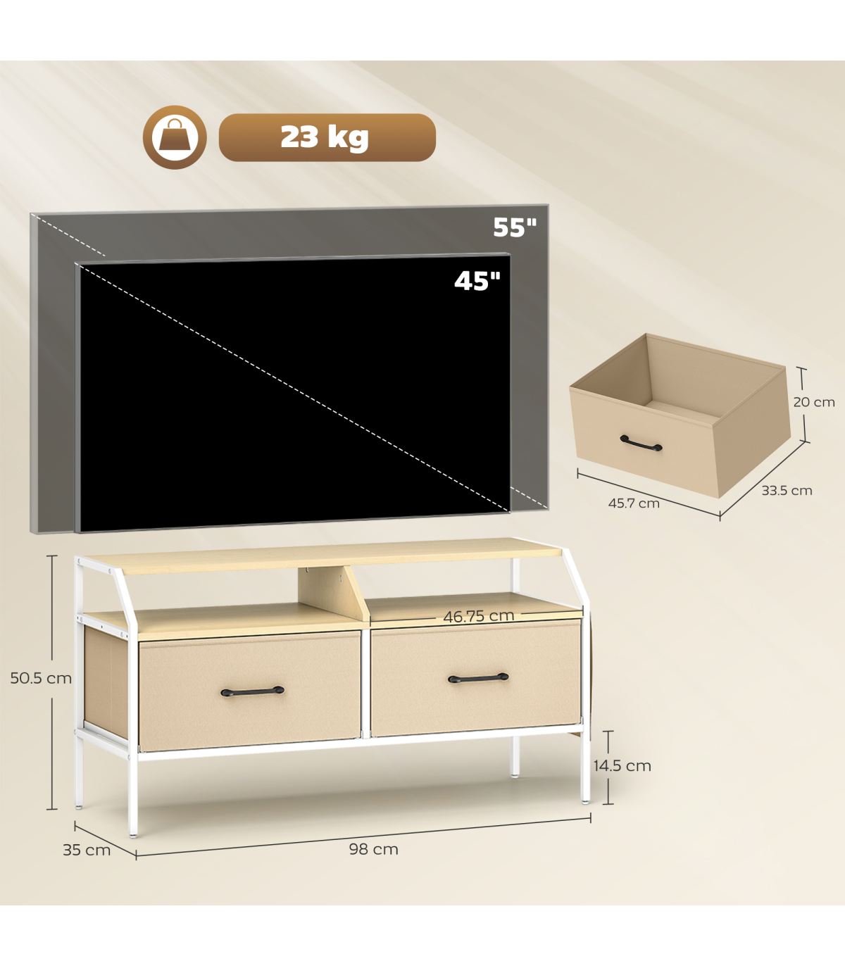 - Weight Capacity: 23 kg (total), 1 kg (drawer/pocket), 10 kg (tabletop), 5 kg (shelf)