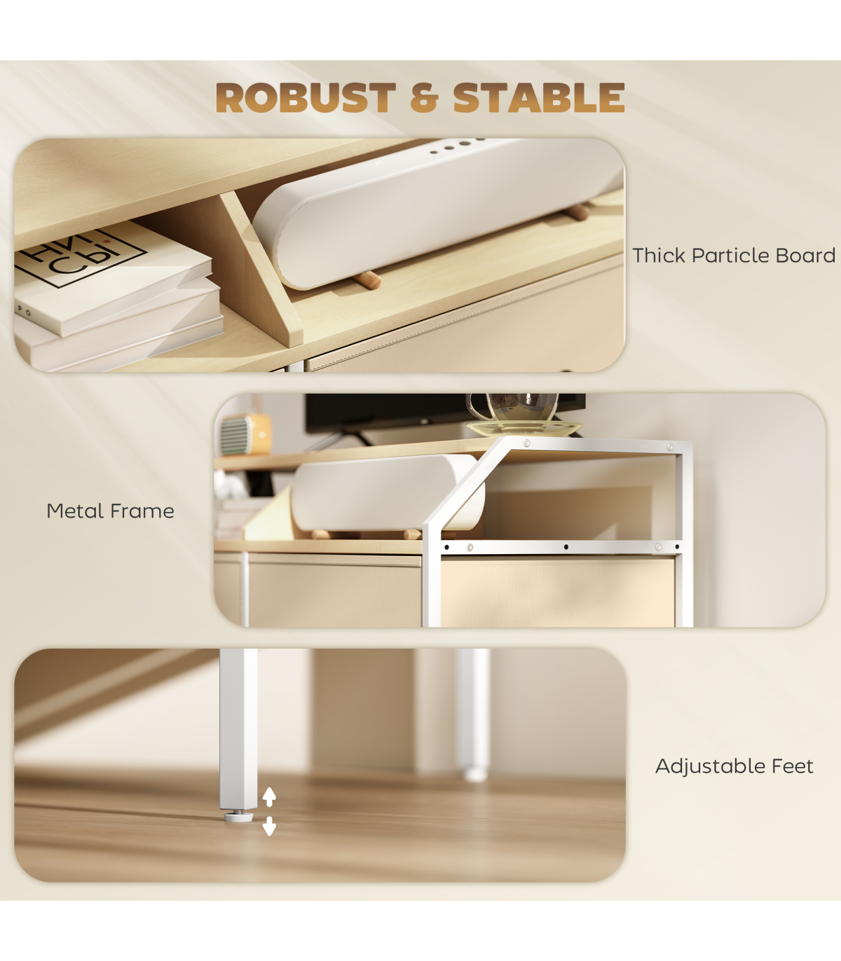 - Thick particleboard and metal frame increase stability and safety