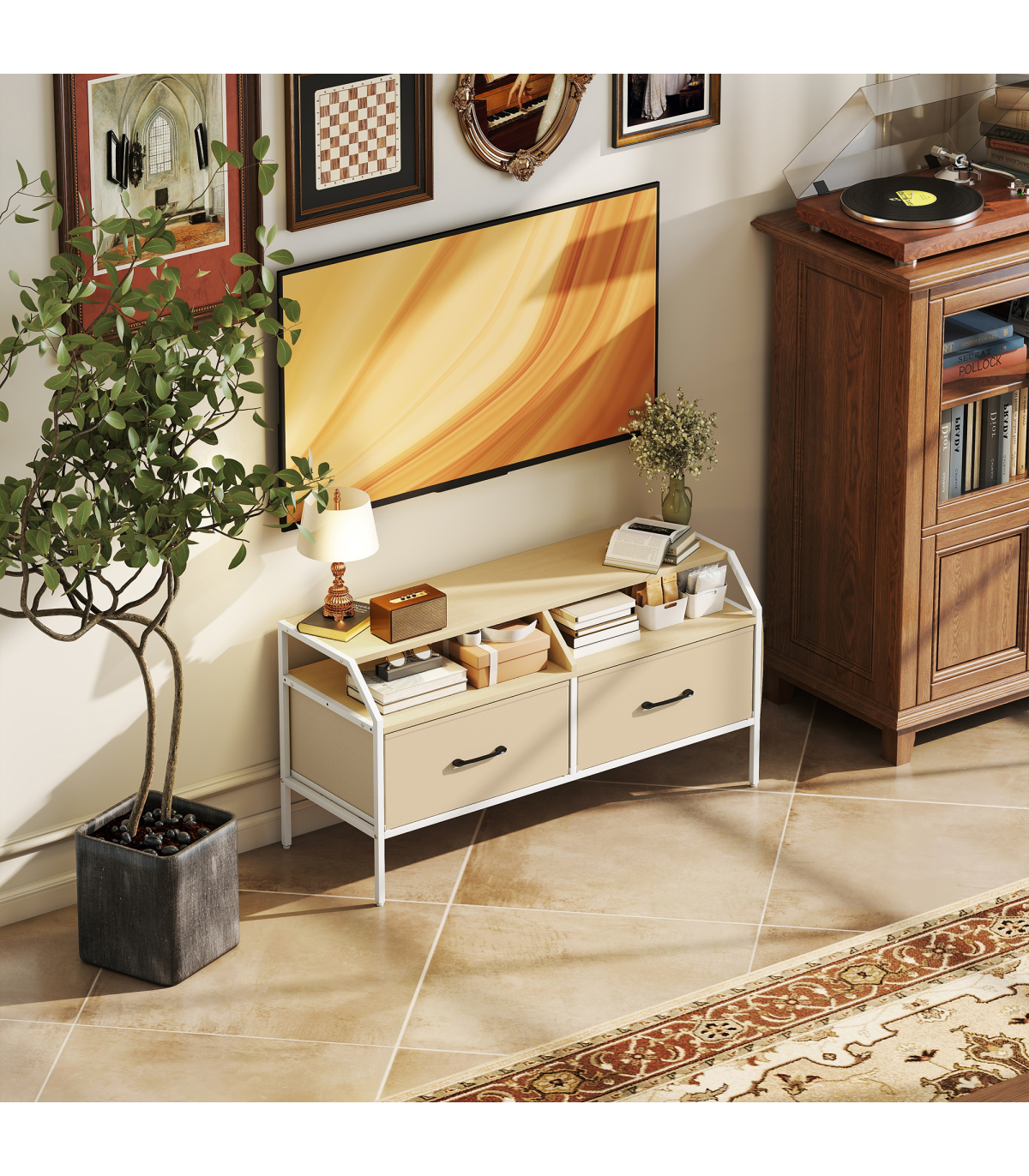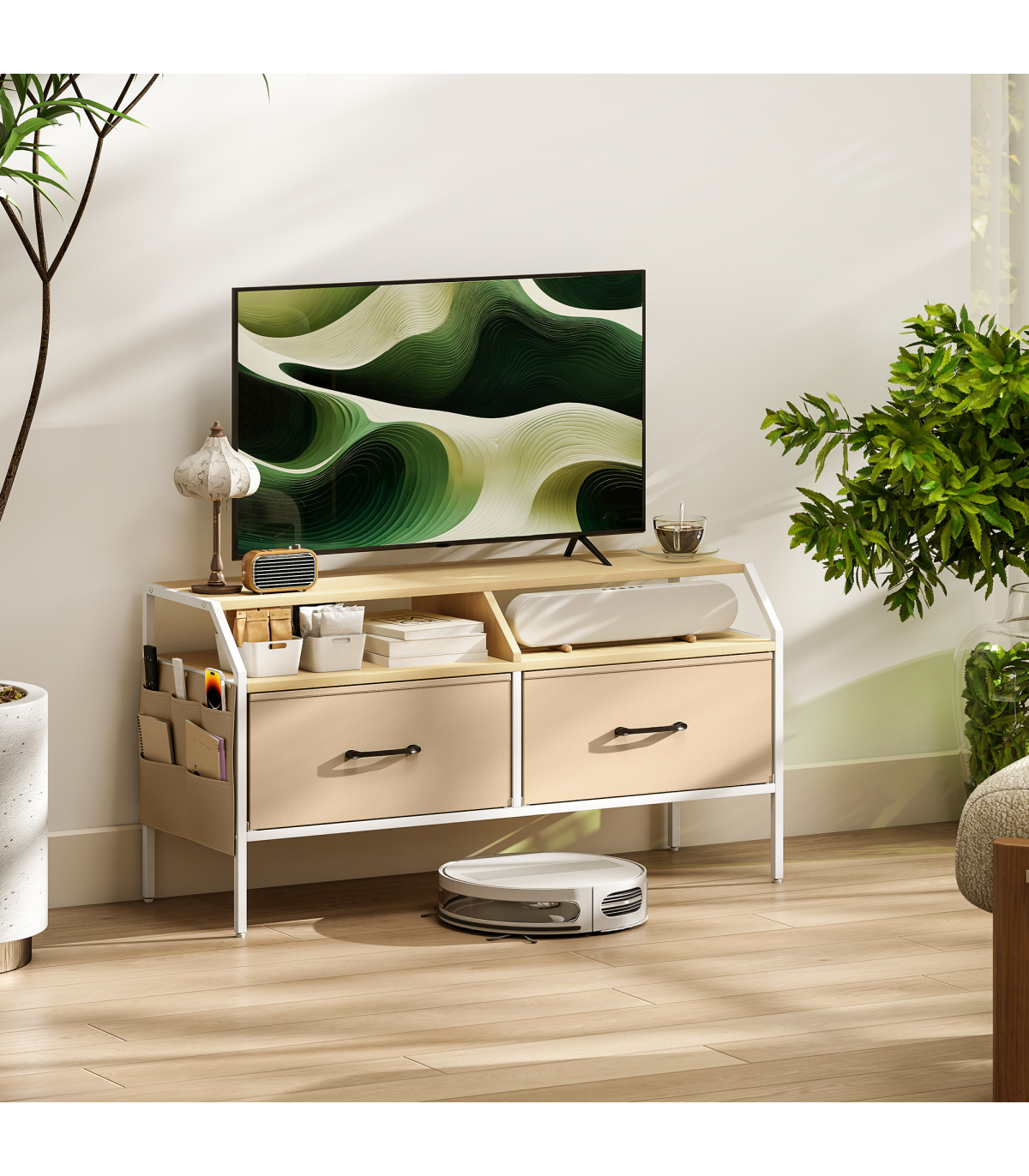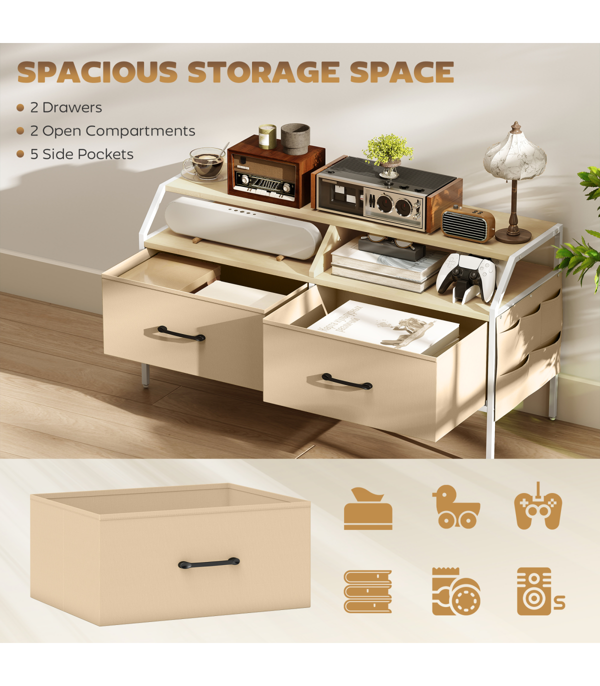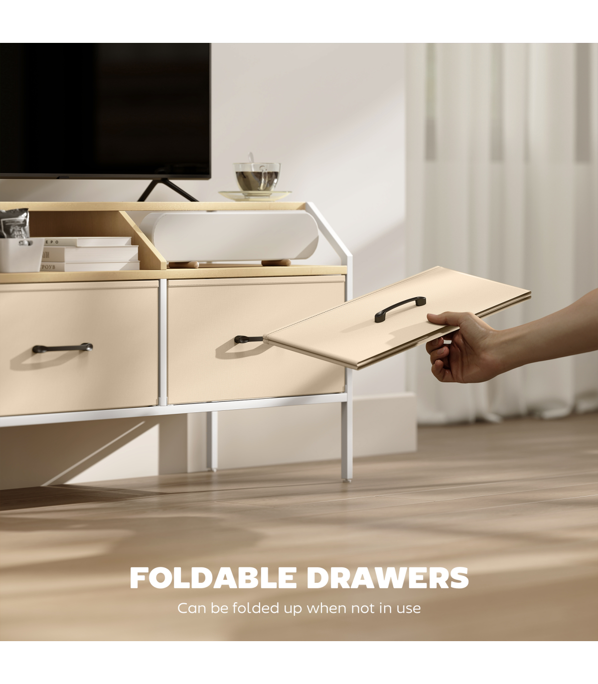- Two foldable drawers and open compartments enhance accessibility
