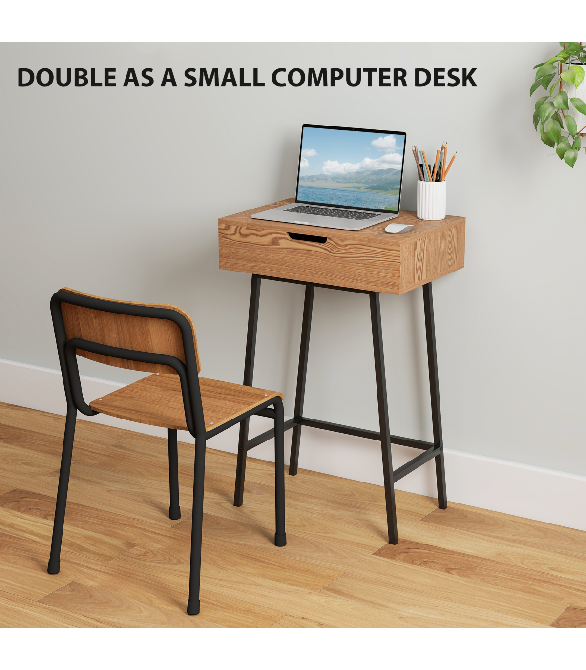 - Industrial style with natural wood effect and sleek black legs