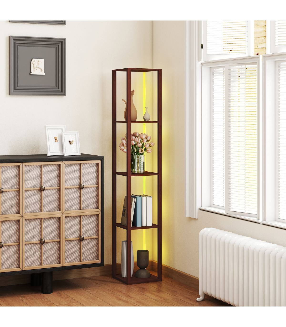 - Four-tier shelves provide lots of storage and display space