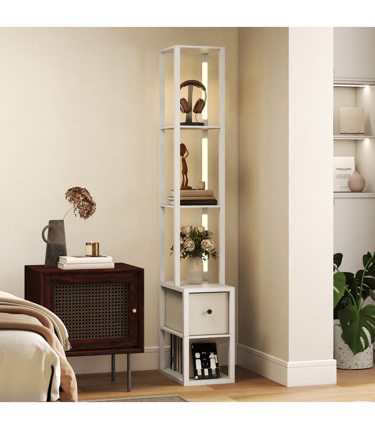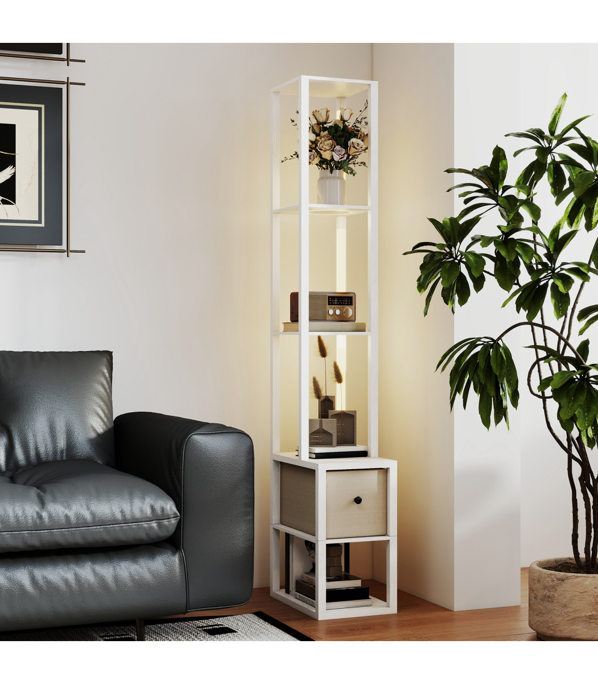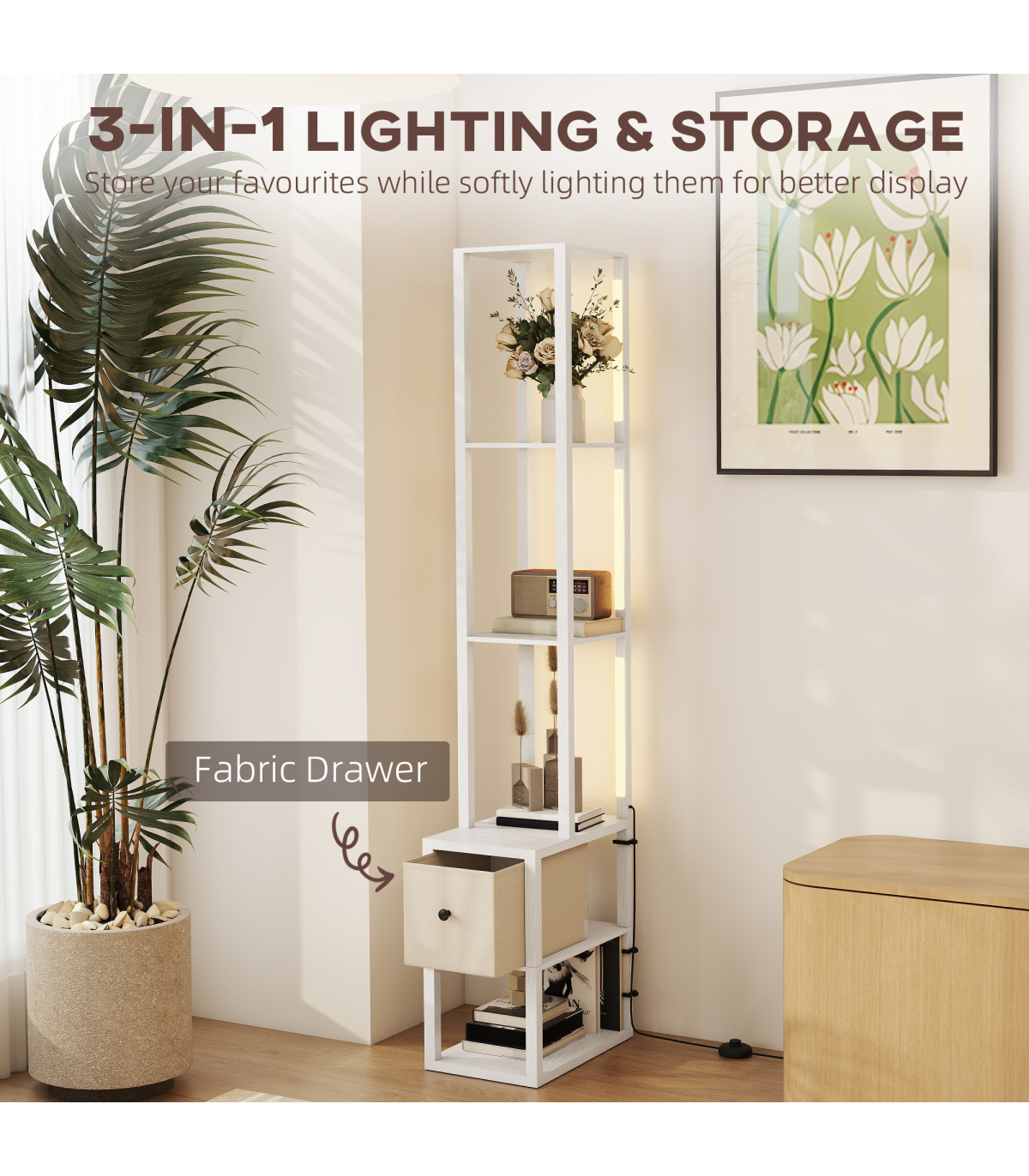 - 3-in-1 floor lamp integrates lighting, storage and display