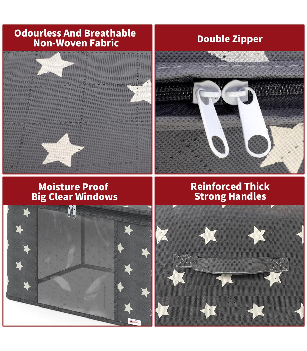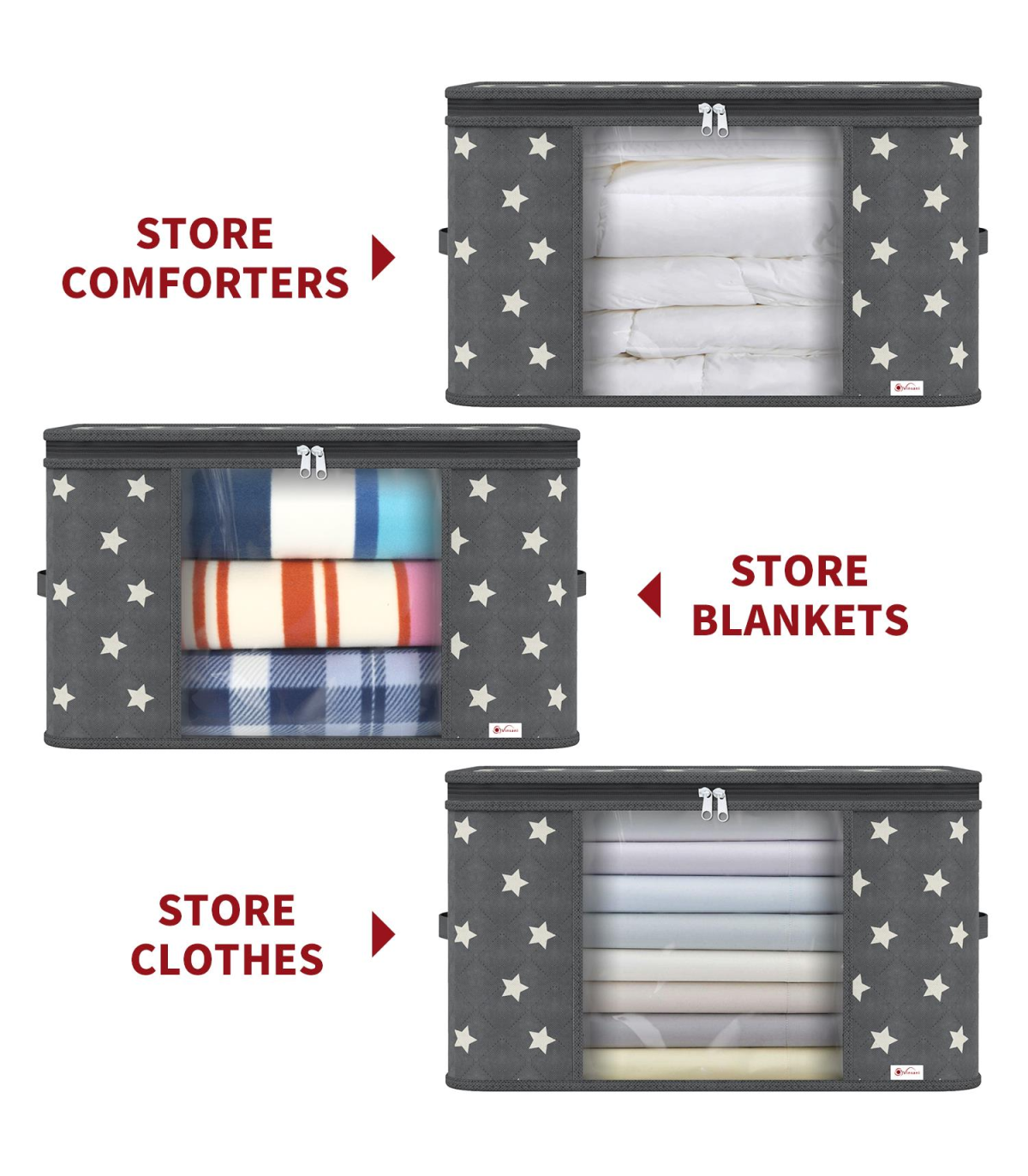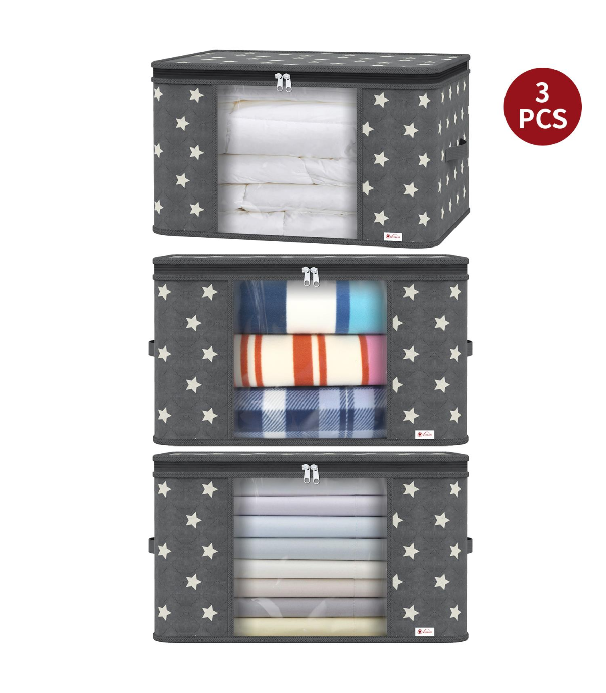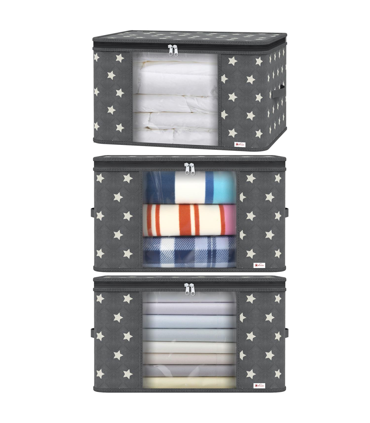 ENORMOUS CAPACITY: Comes in a set of 3 bags, each measuring 60 X 43 X 35 cm. Clothing, blankets, pillows, comforters, and other household goods can all be stored in this huge storage bag. These can also be used to hold shoes, toys, small electronics, stationery, towels, and groceries, among other things. These storage bag organizers will come in handy for your household.