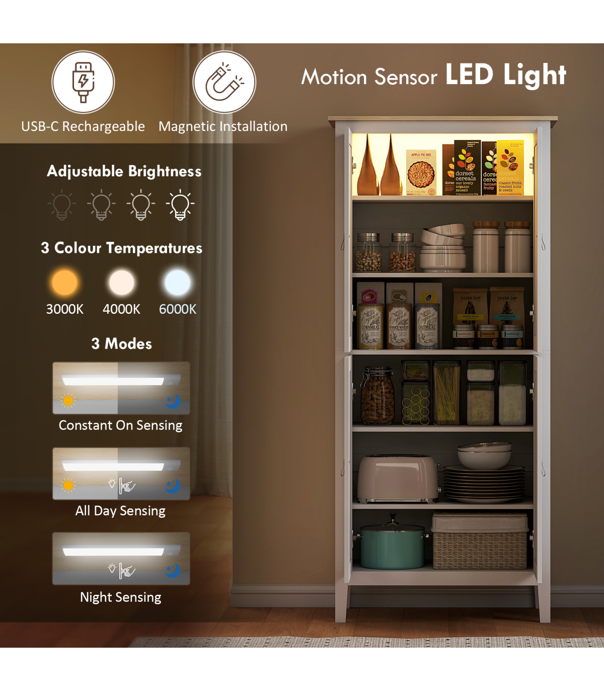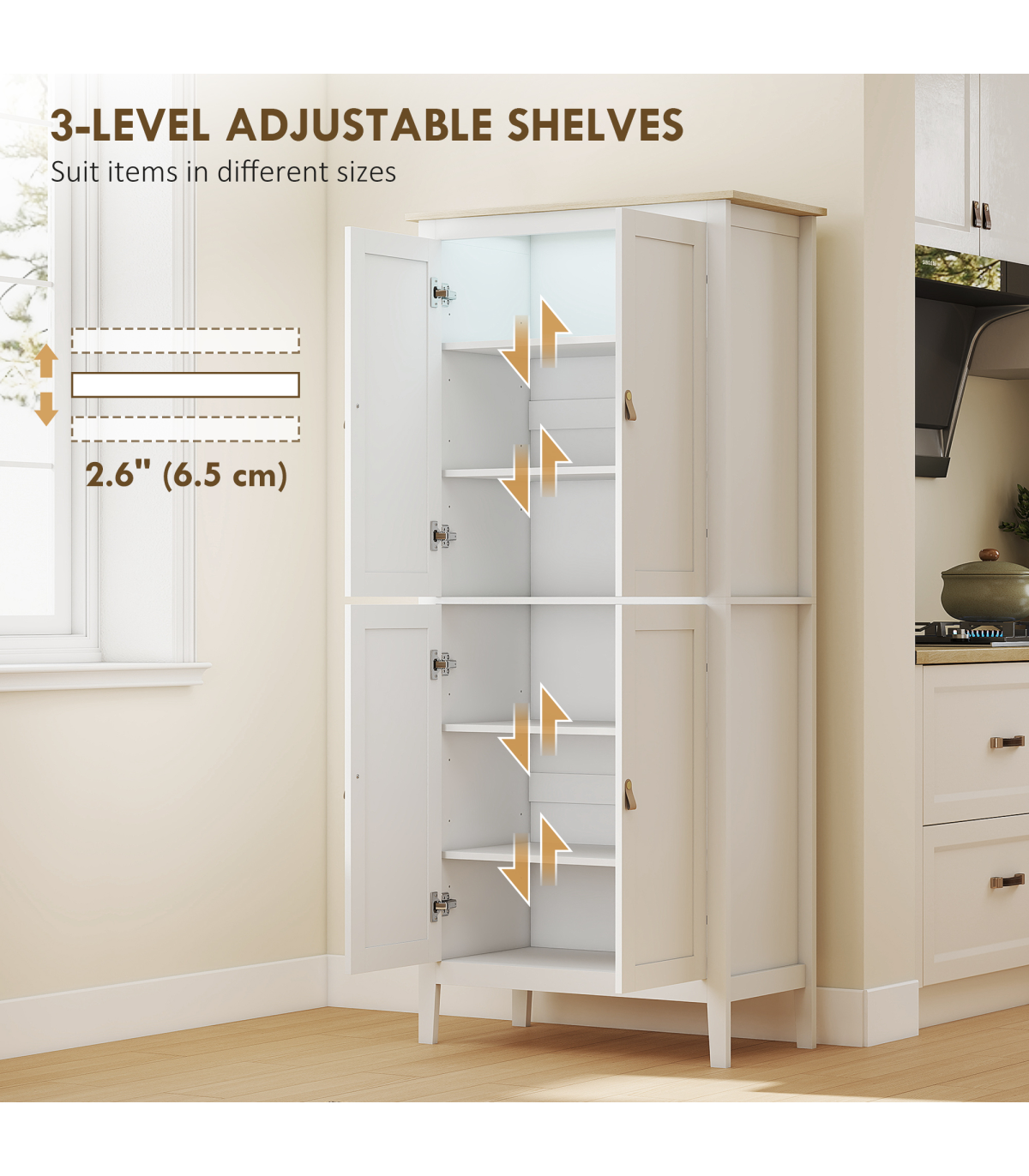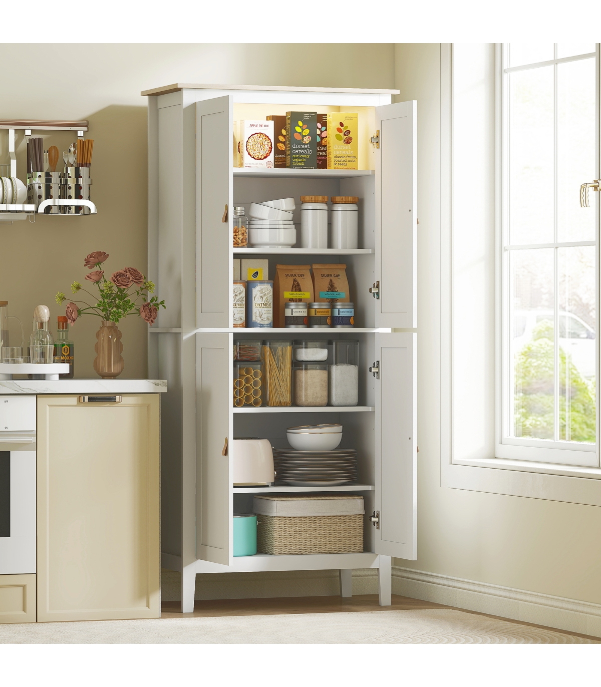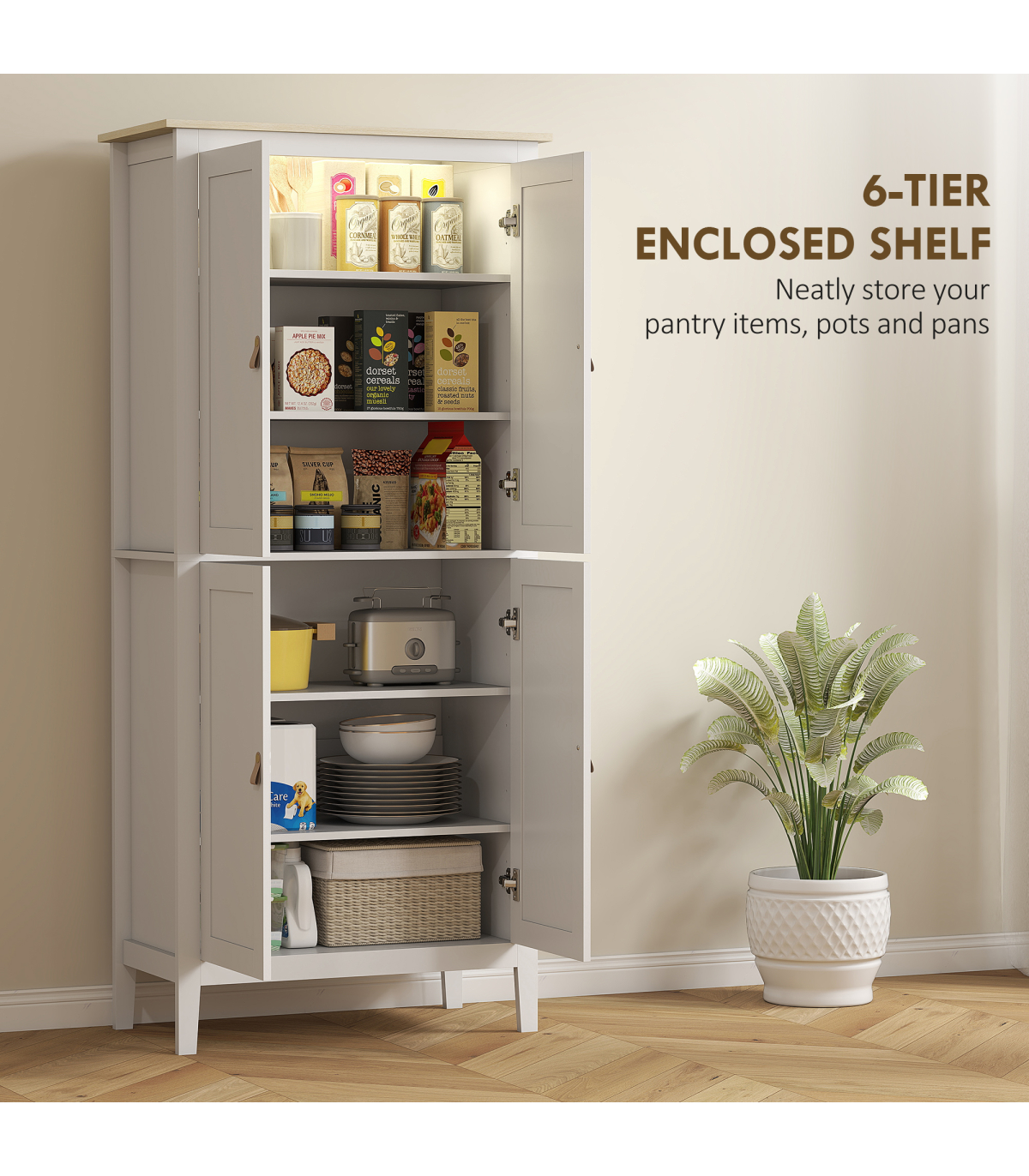 - Six-tier storage in two cupboards holds pantry items and more