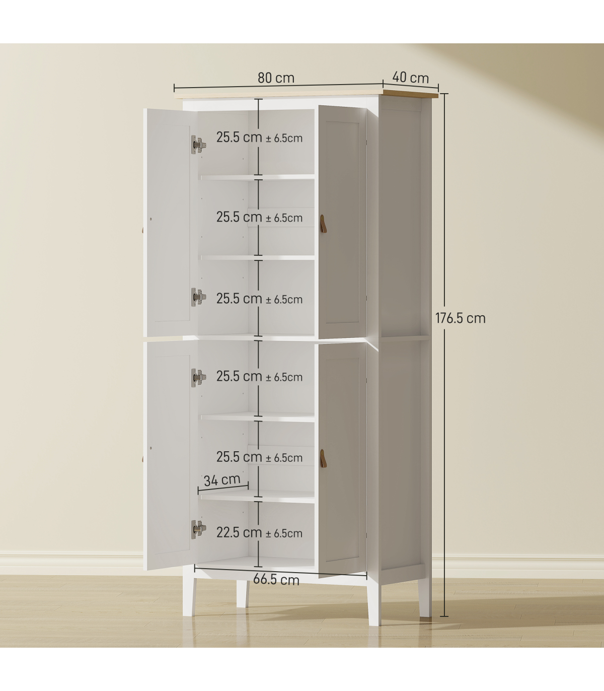 - Cupboard Inner Size: 66.5W x 34D x 78H cm (top), 66.5W x 34D x 75.5H cm (bottom)
