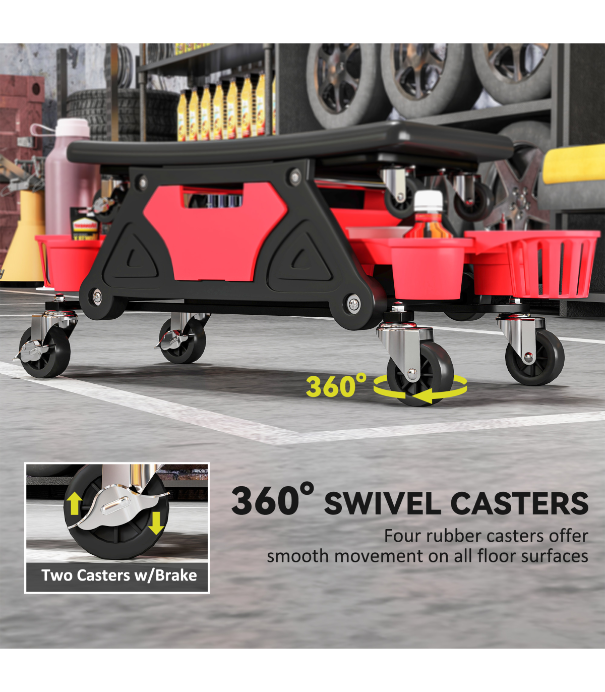 - Braking casters secure seat in place on any surface