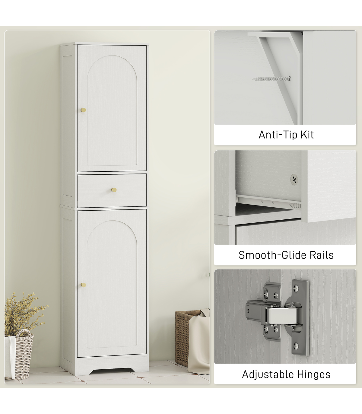 - Tall, slim design fits easily into small or narrow bathroom spaces
