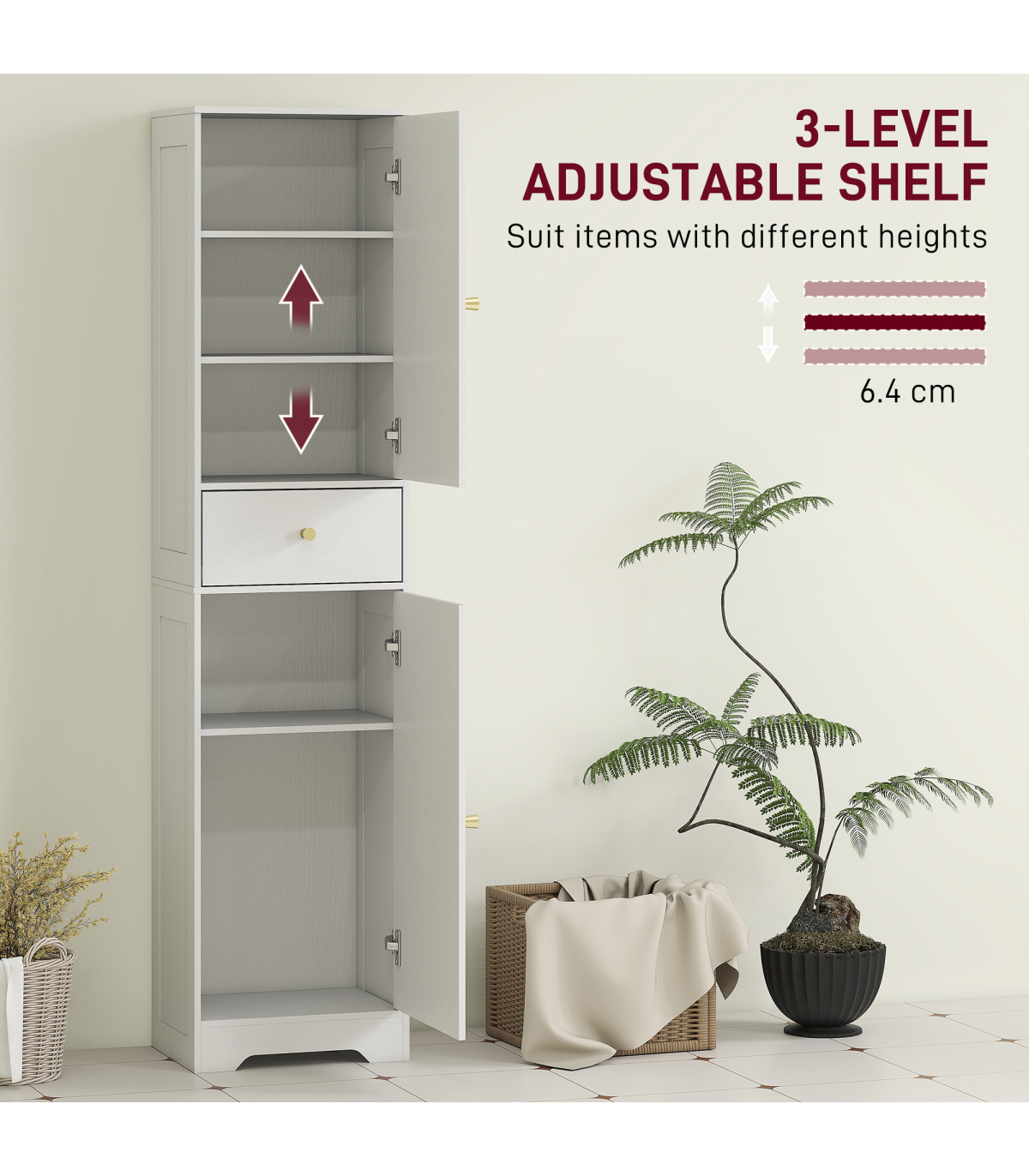 - Adjustable shelf offers flexible storage for bottles, towels and more