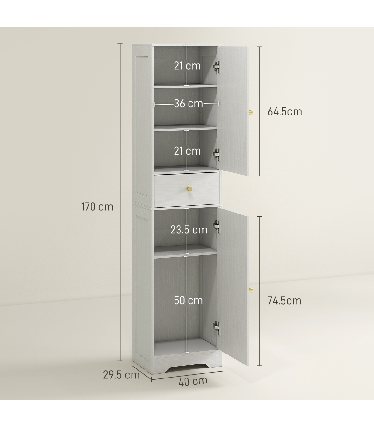 - Cupboard Inner Size: 36W x 25D x 65.5H cm (top), 36W x 25D x 75H cm (bottom)