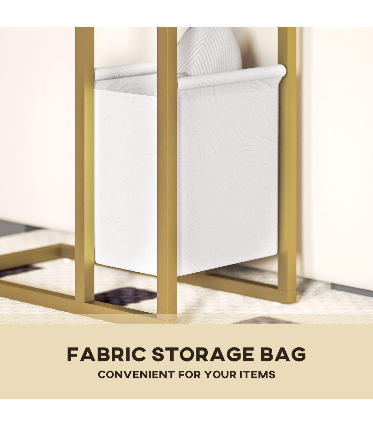 - Flat tabletop and bottom fabric storage bag keeps essentials within reach