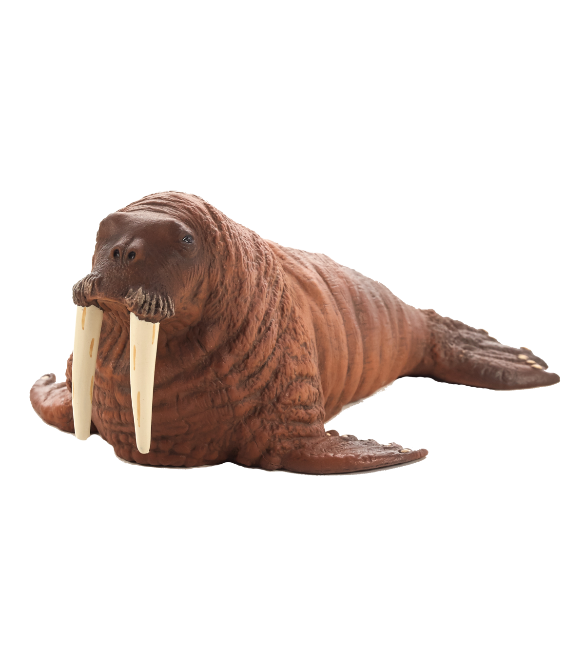 The mustached and long-tusked walrus is most often found near the Arctic Circle, lying on the ice with hundreds of companions. These marine mammals are extremely sociable, prone to loudly bellowing and snorting at one another, but are aggressive during mating season. With wrinkled brown and pink hides, walruses are distinguished by their long white tusks, grizzly whiskers, flat flipper, and bodies full of bluer.