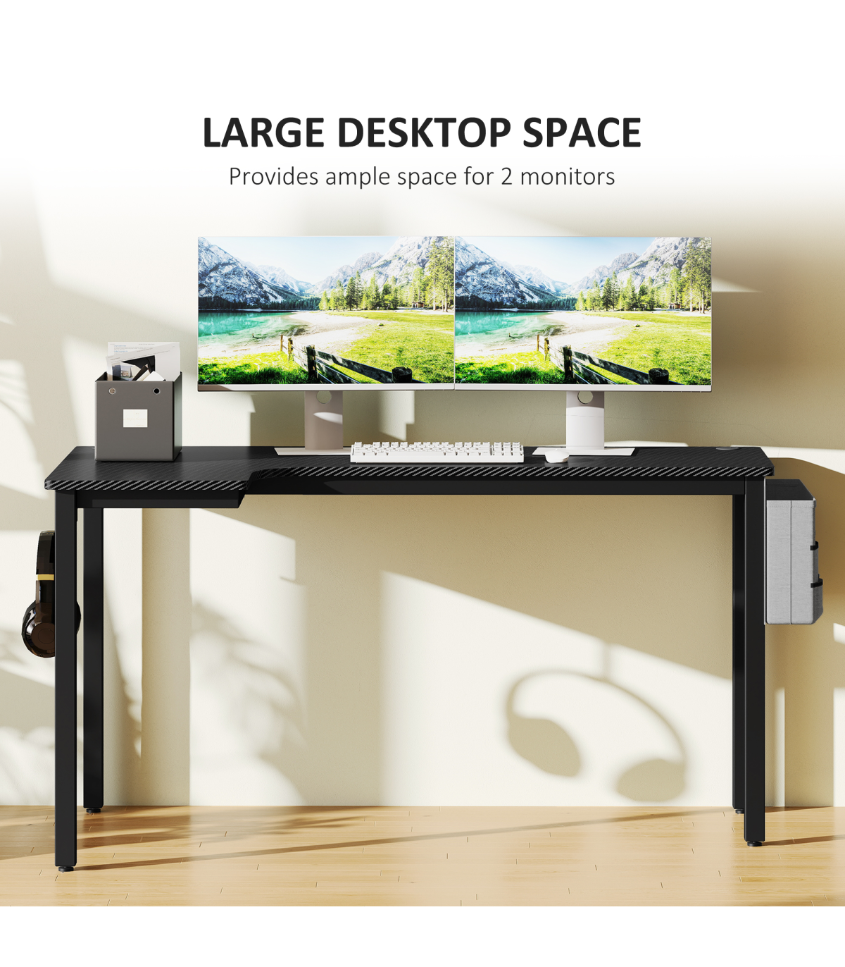 - Spacious: holds two screens, printer, keyboard, mouse and smaller items