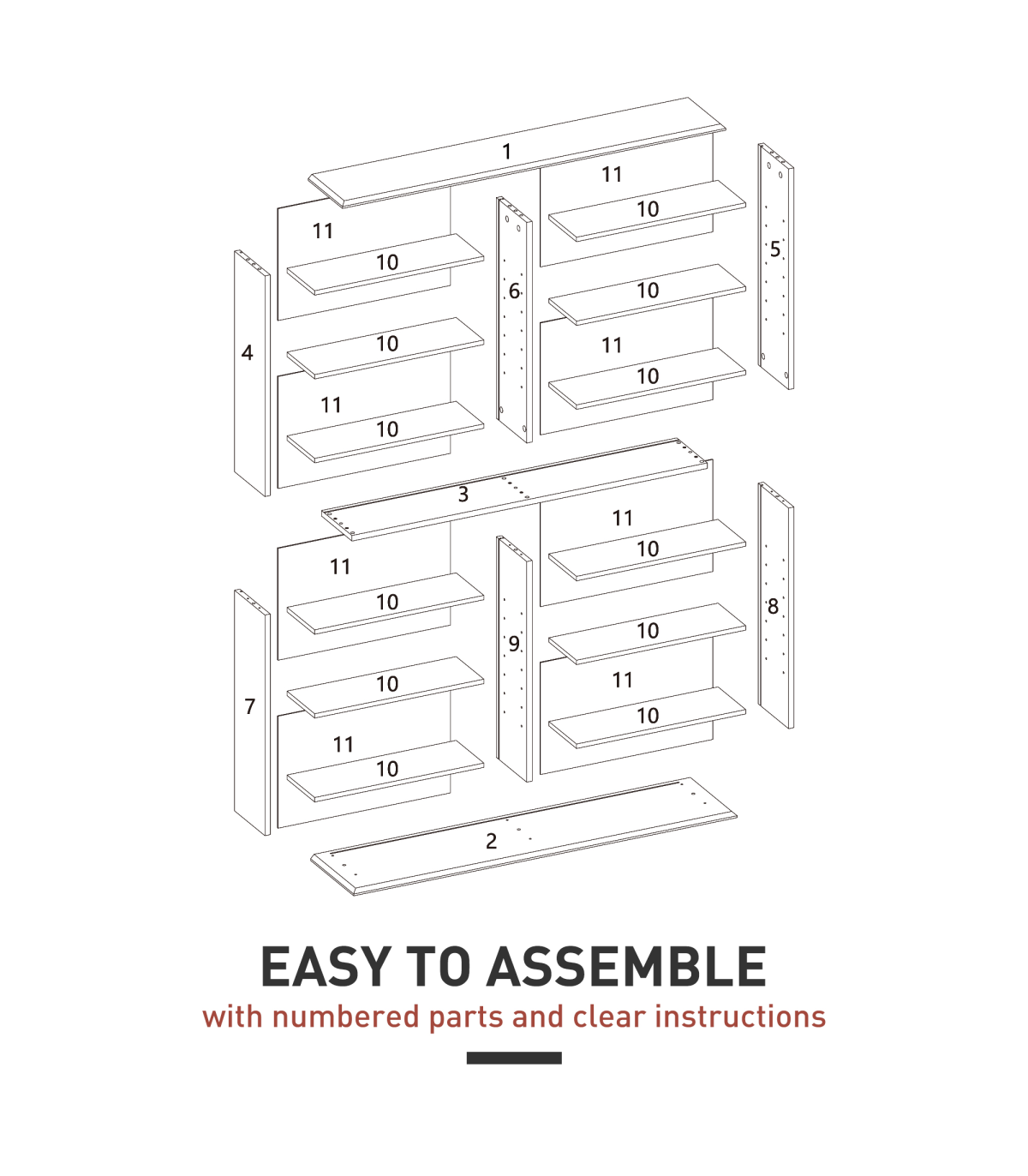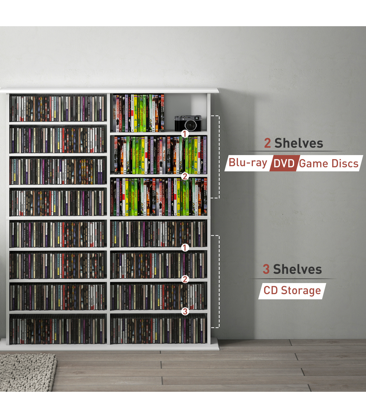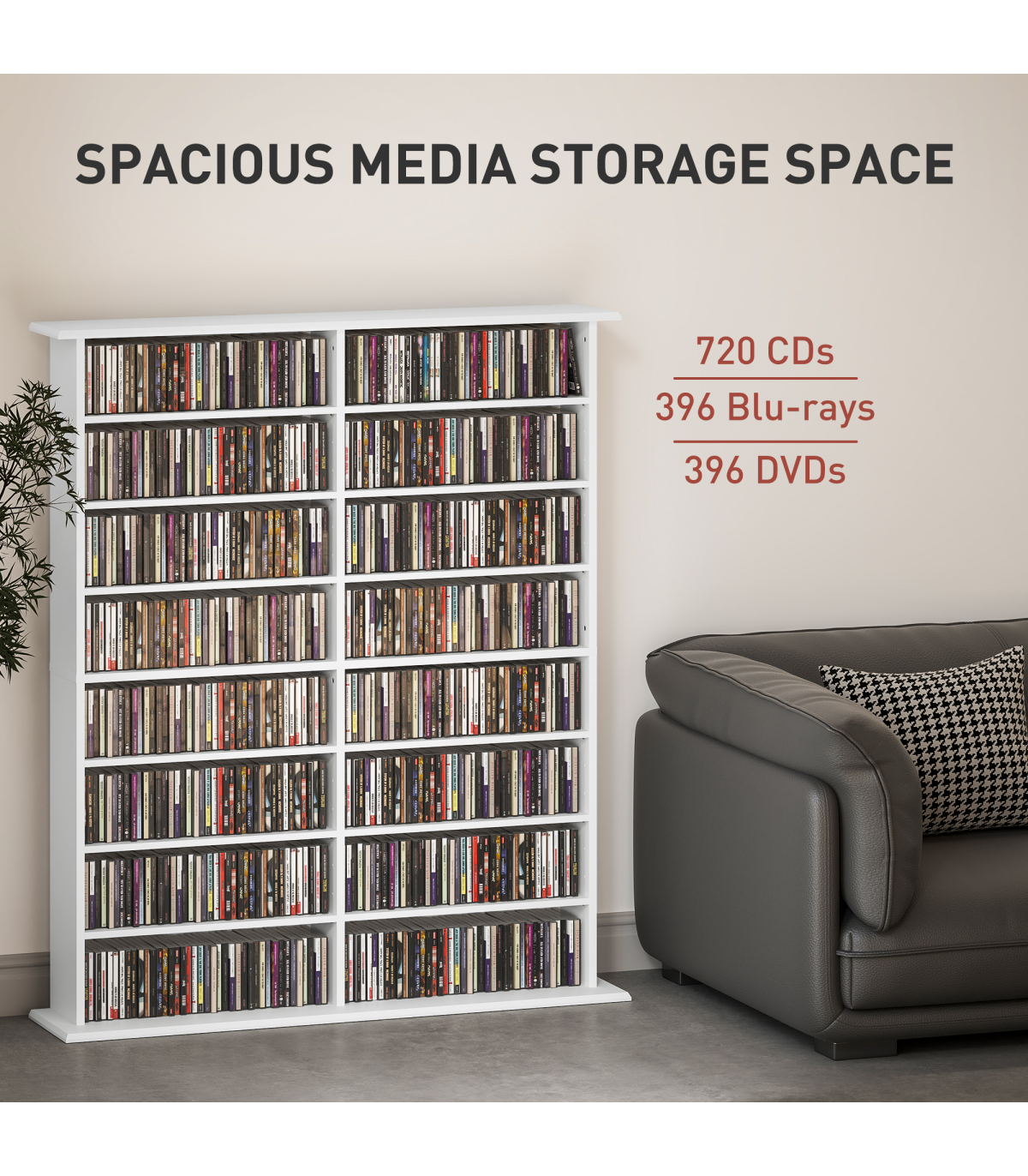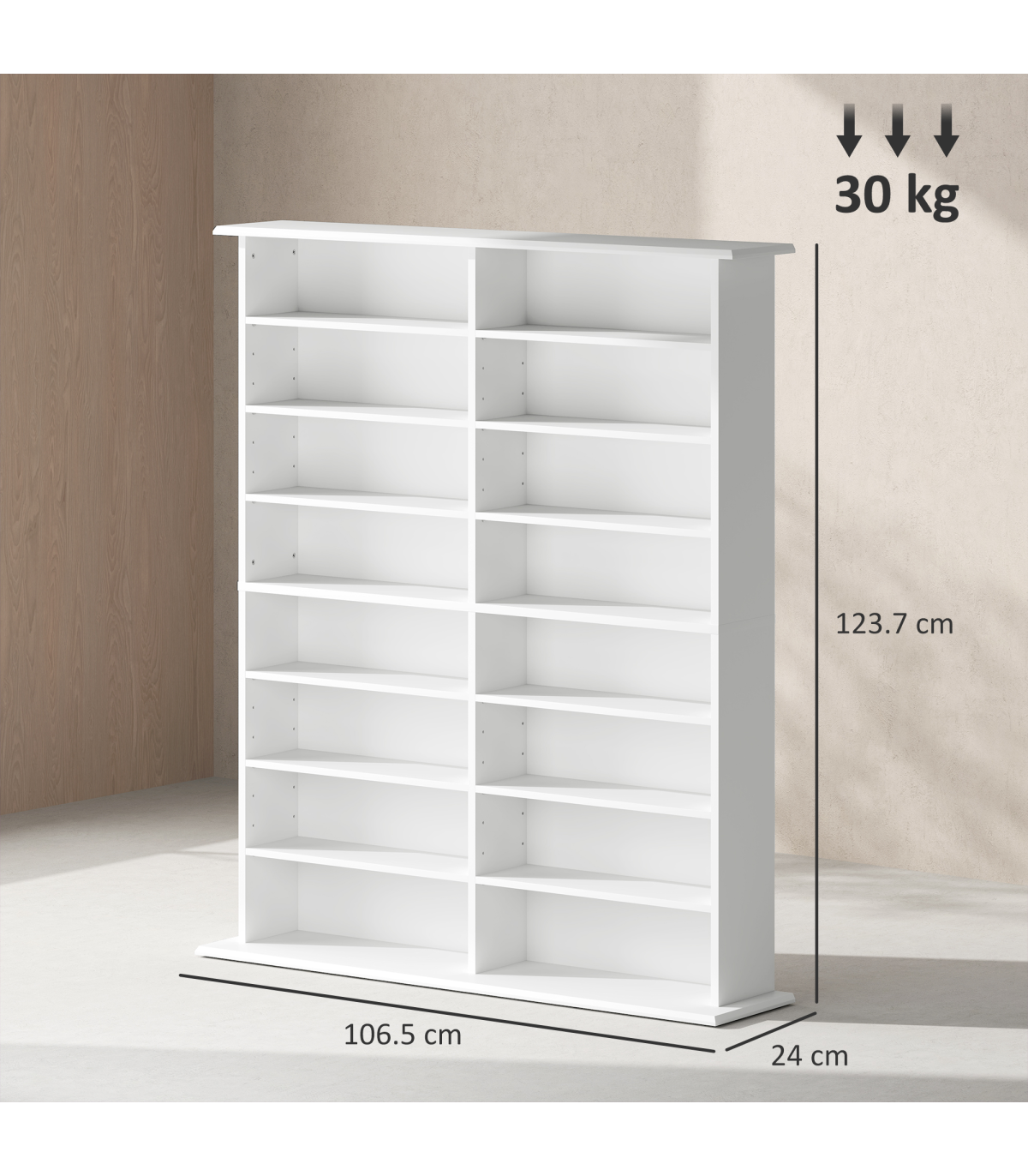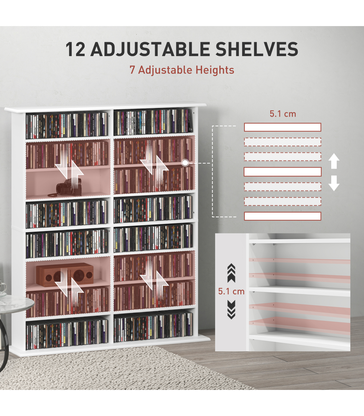 - 16 compartments, with 12 adjustable shelves: room for 720 CDs, 396 DVDs or 396 Blu-rays