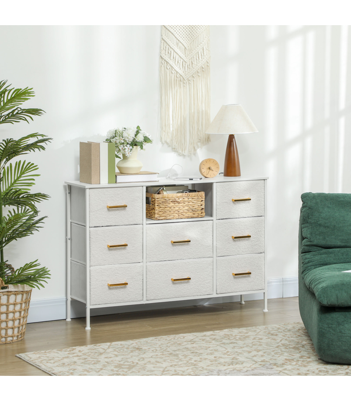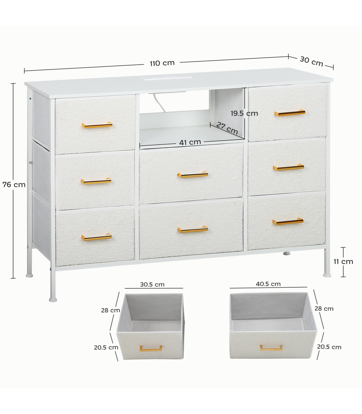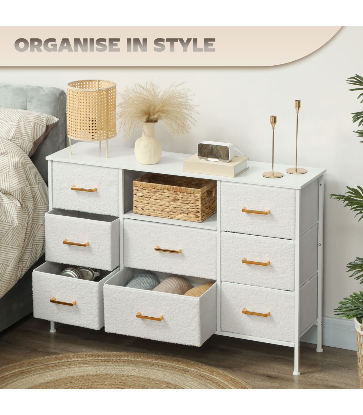 - Boucle fabric drawers and gold-tone handles add a stylish touch to interiors