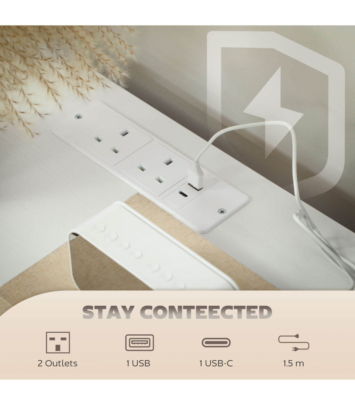 - Two power outlets, a USB, a USB-C port charge devices conveniently, with a 1.5-m power cord