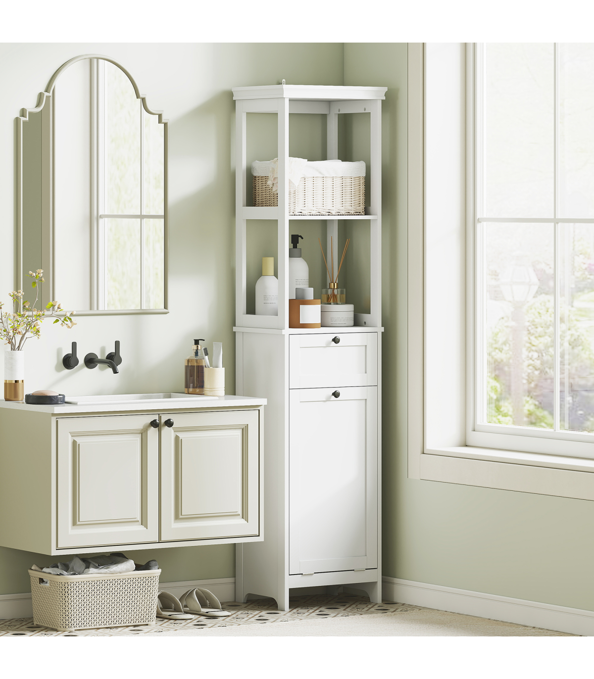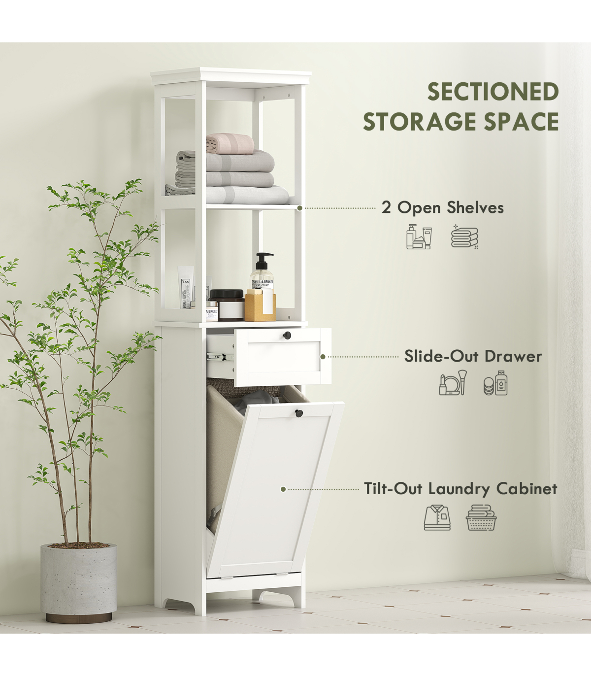 - 30 L tilting bottom hamper to keep dirty clothes stored together. Removable basket to carry to washing machine