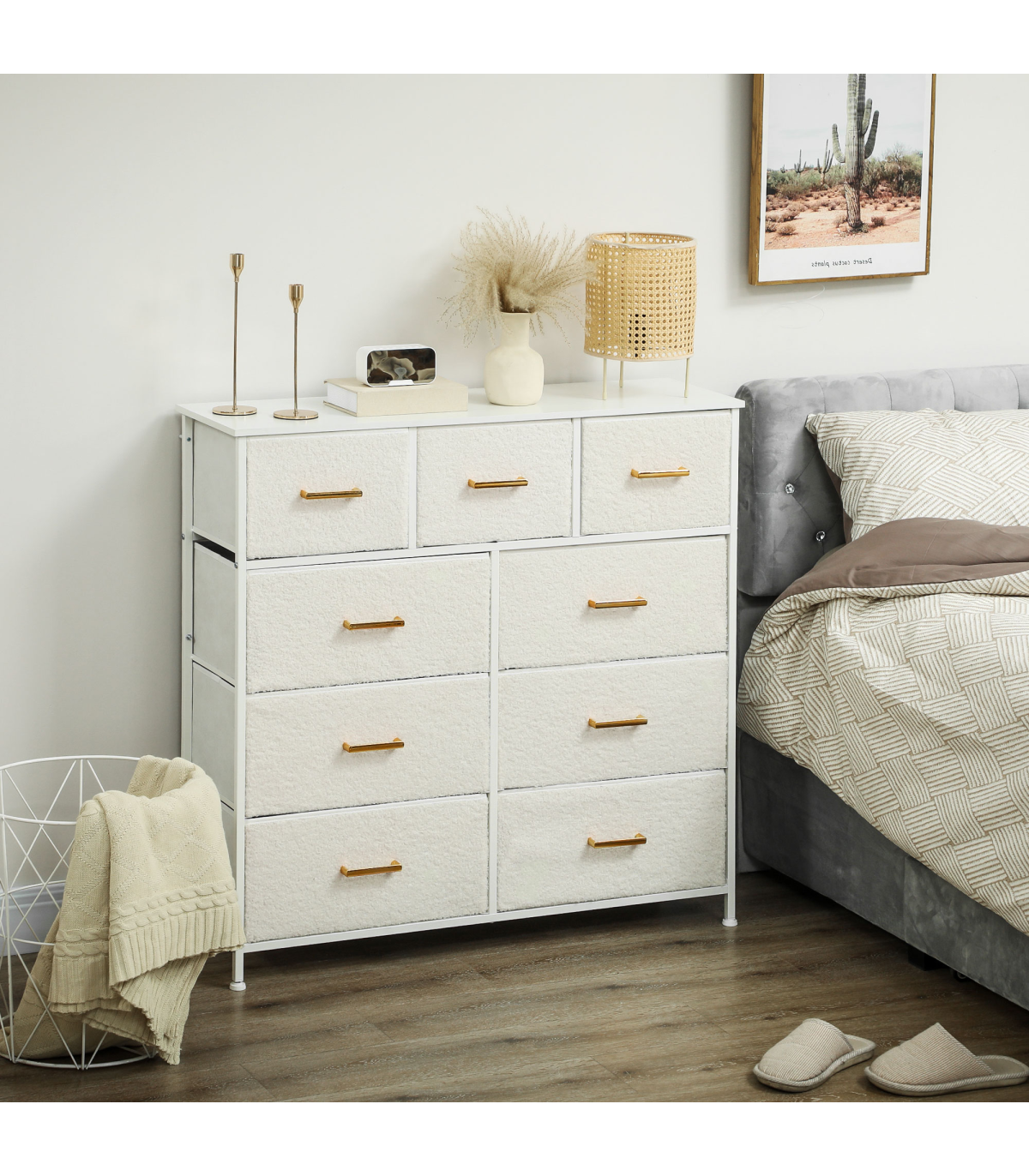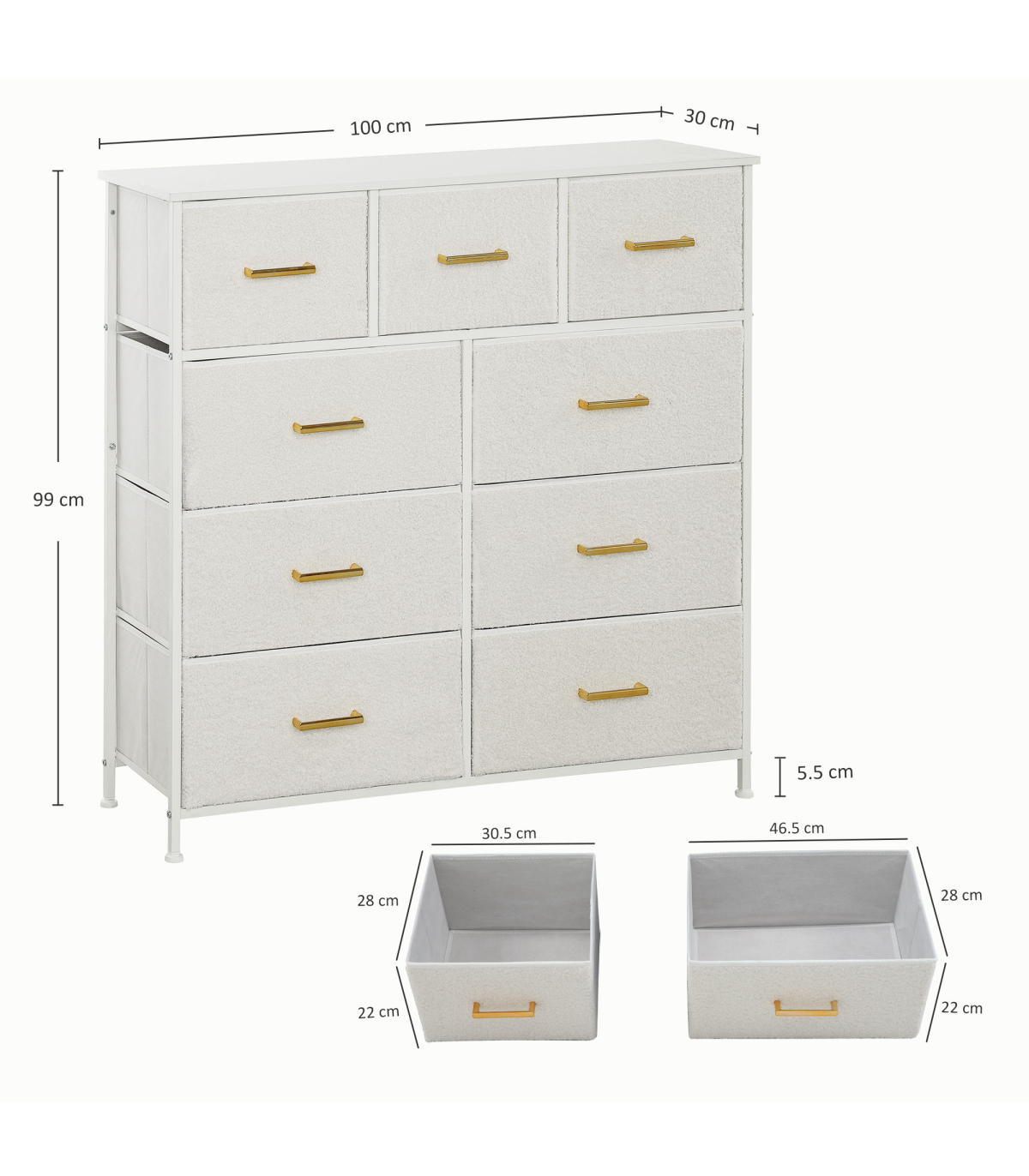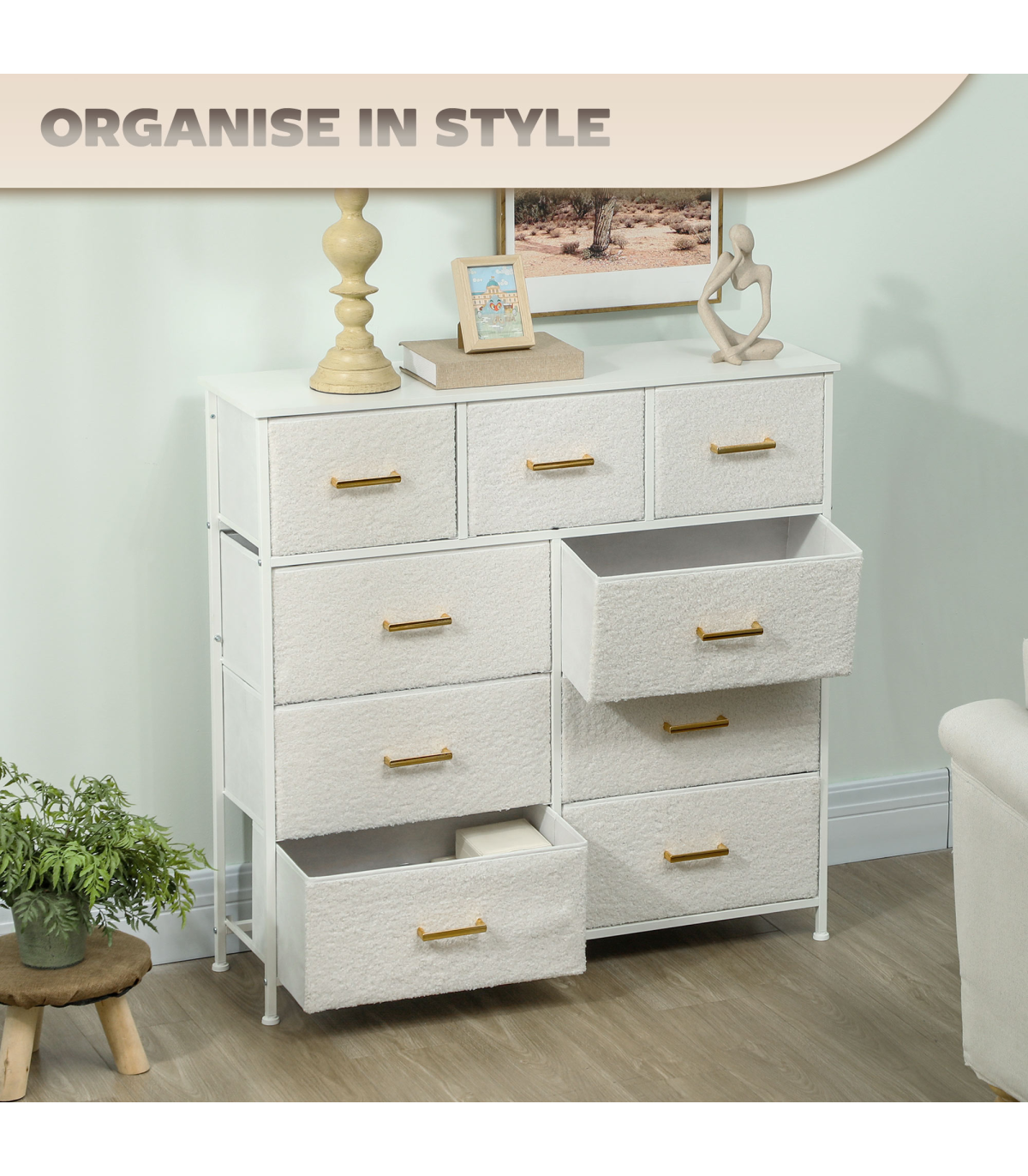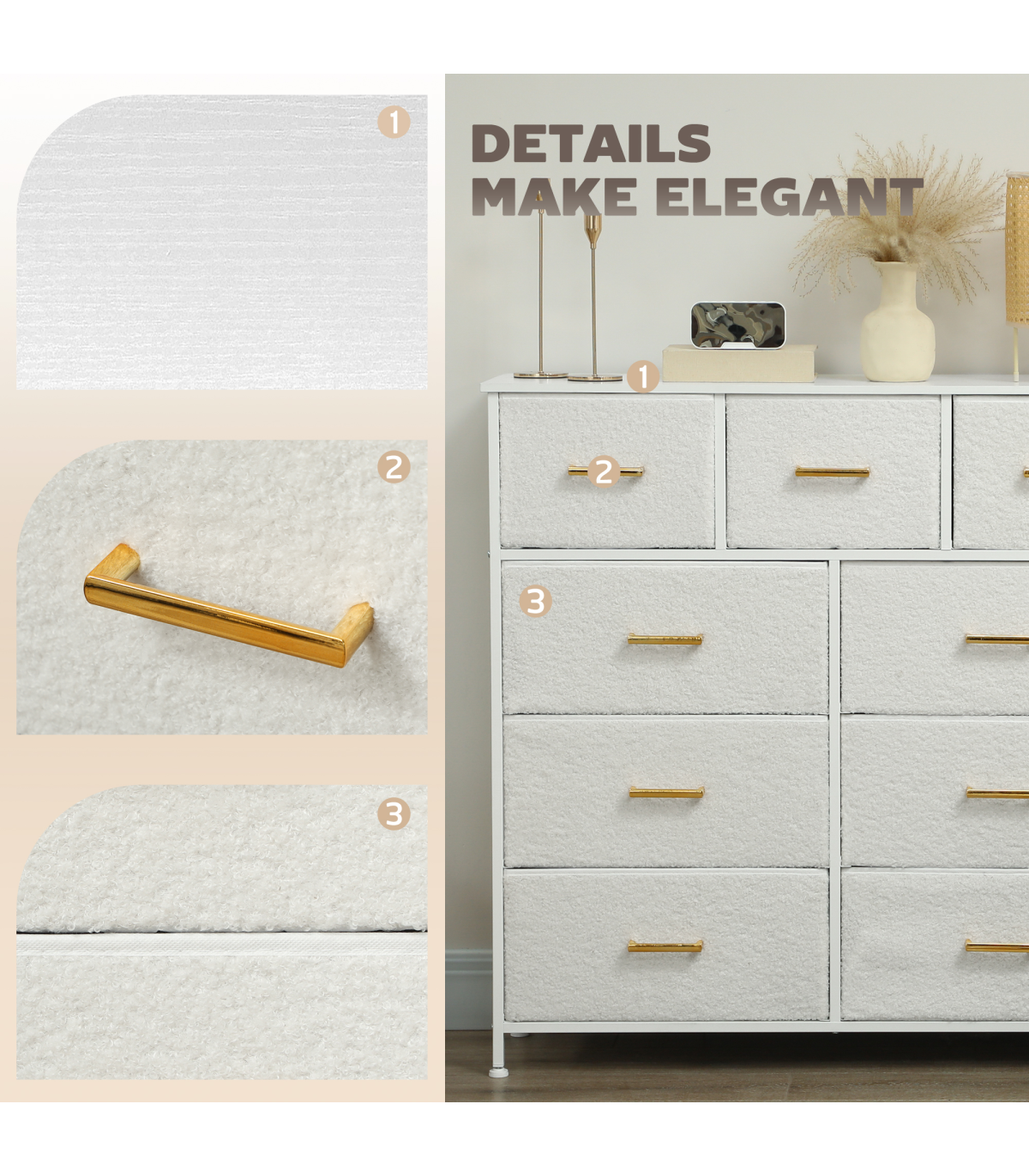 - Boucle fabric drawers and gold-tone handles add a stylish touch to interiors