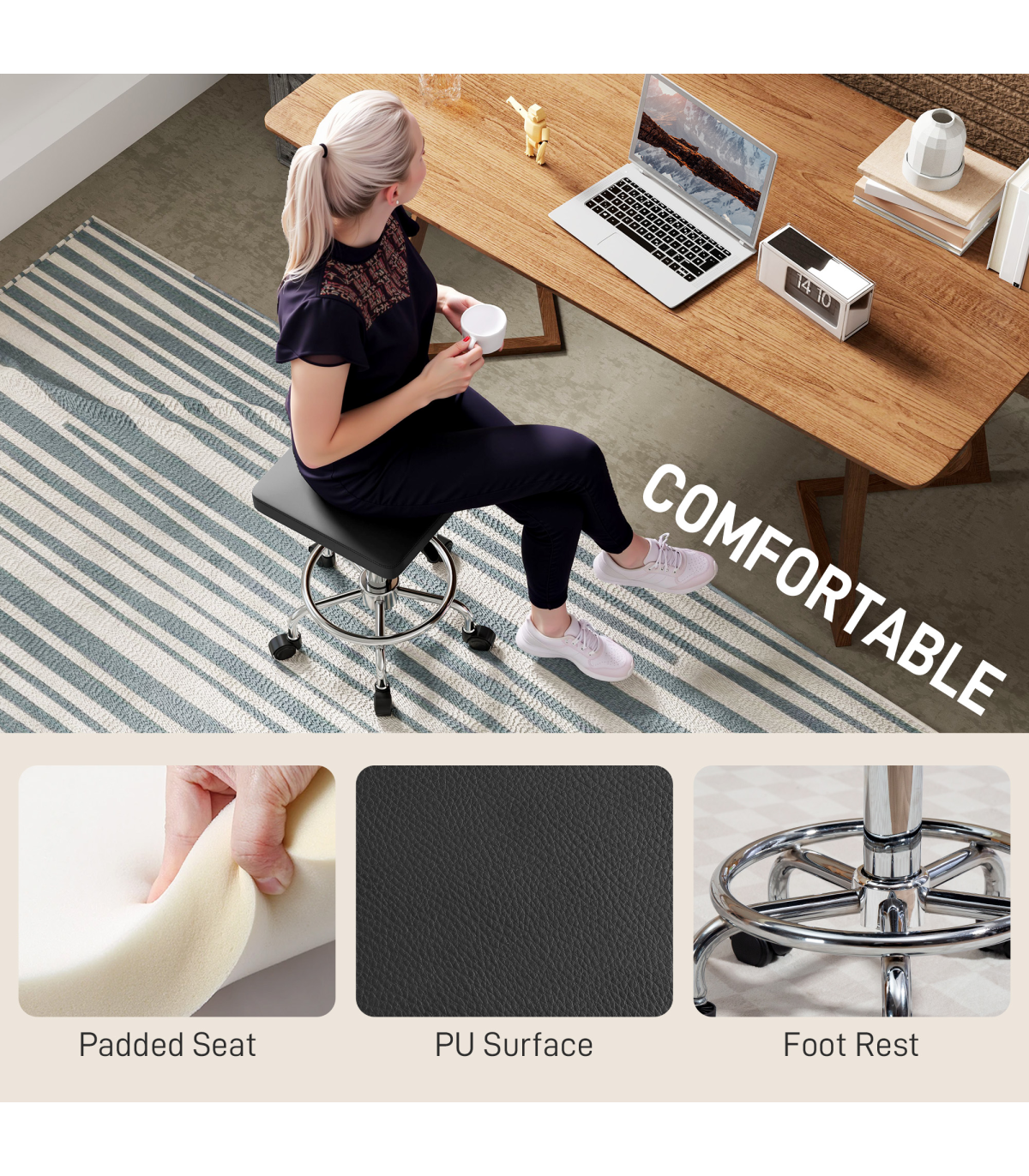 - Foam padded seat for comfort, wrapped in sleek faux leather
