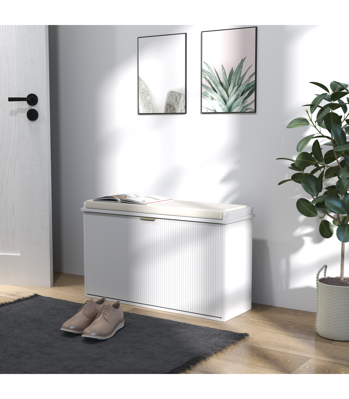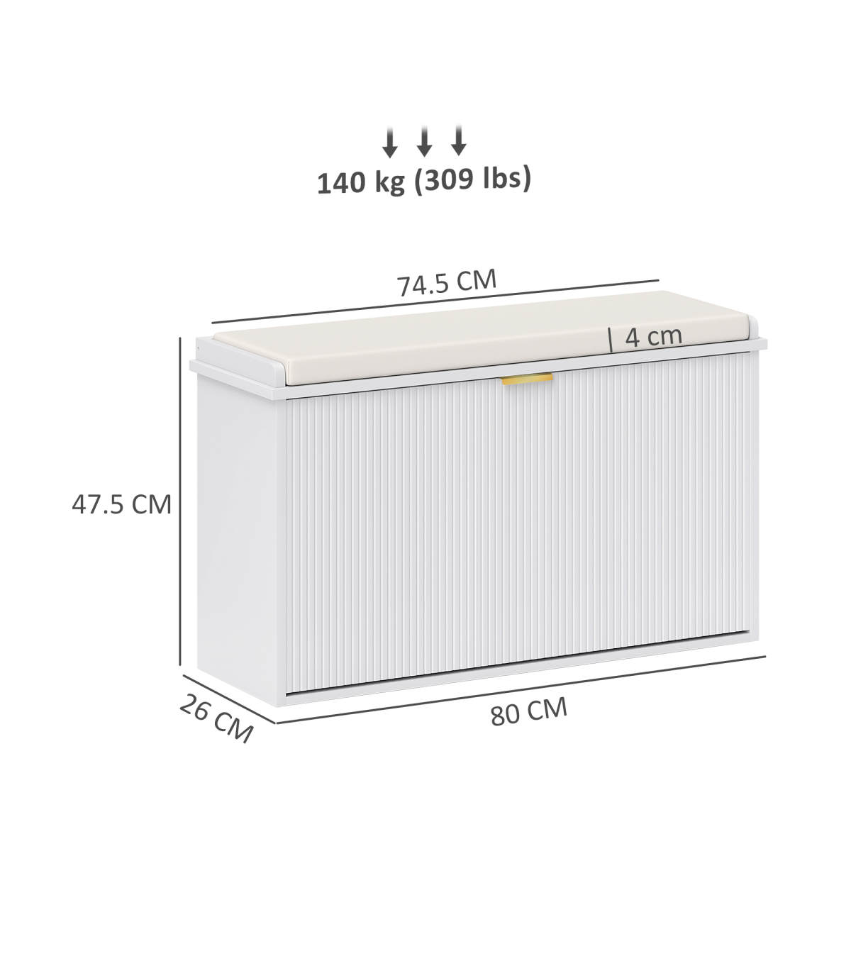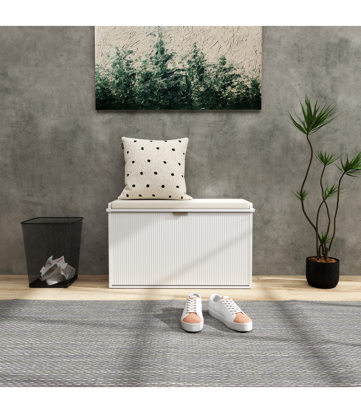 - This hallway storage bench, made of particleboard and MDF, supports up to 120 kg on the seat