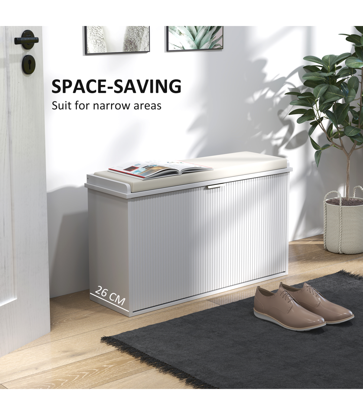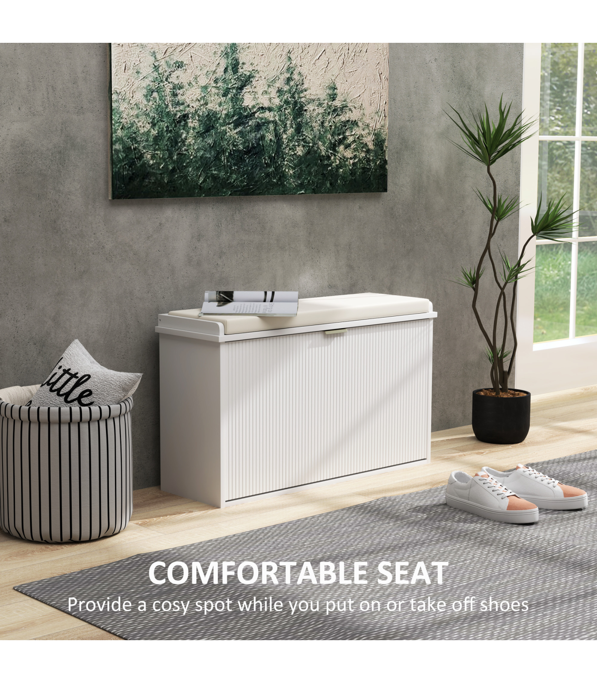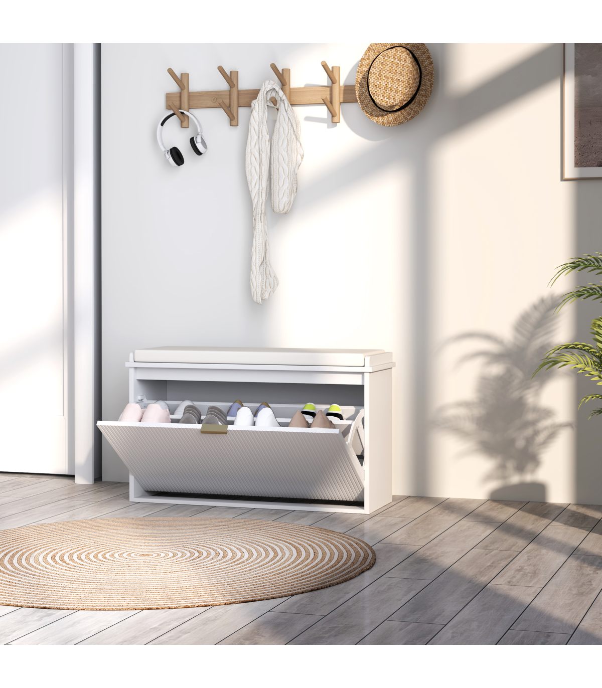 - This hallway storage bench, made of particleboard and MDF, supports up to 120 kg on the seat