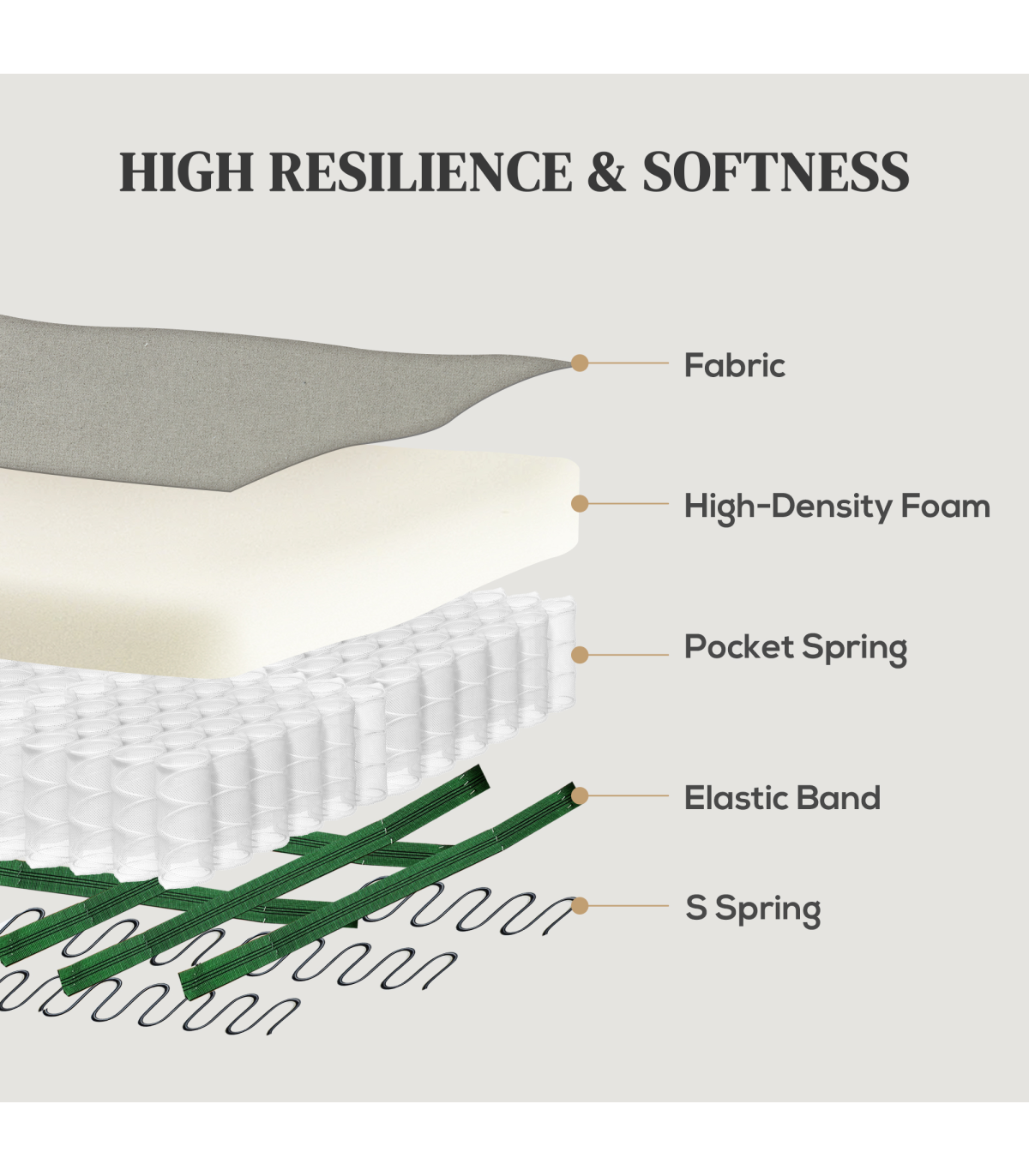 - Inner pocket springs, S spring and elastic bands to retain the shape