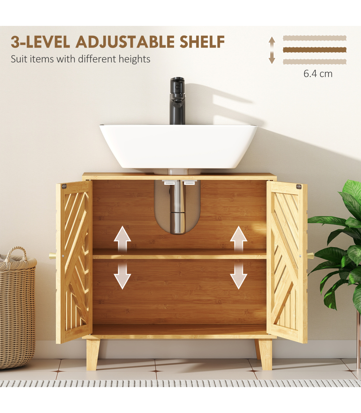 ● Three-level adjustable shelf offers flexible storage for bottles and towels