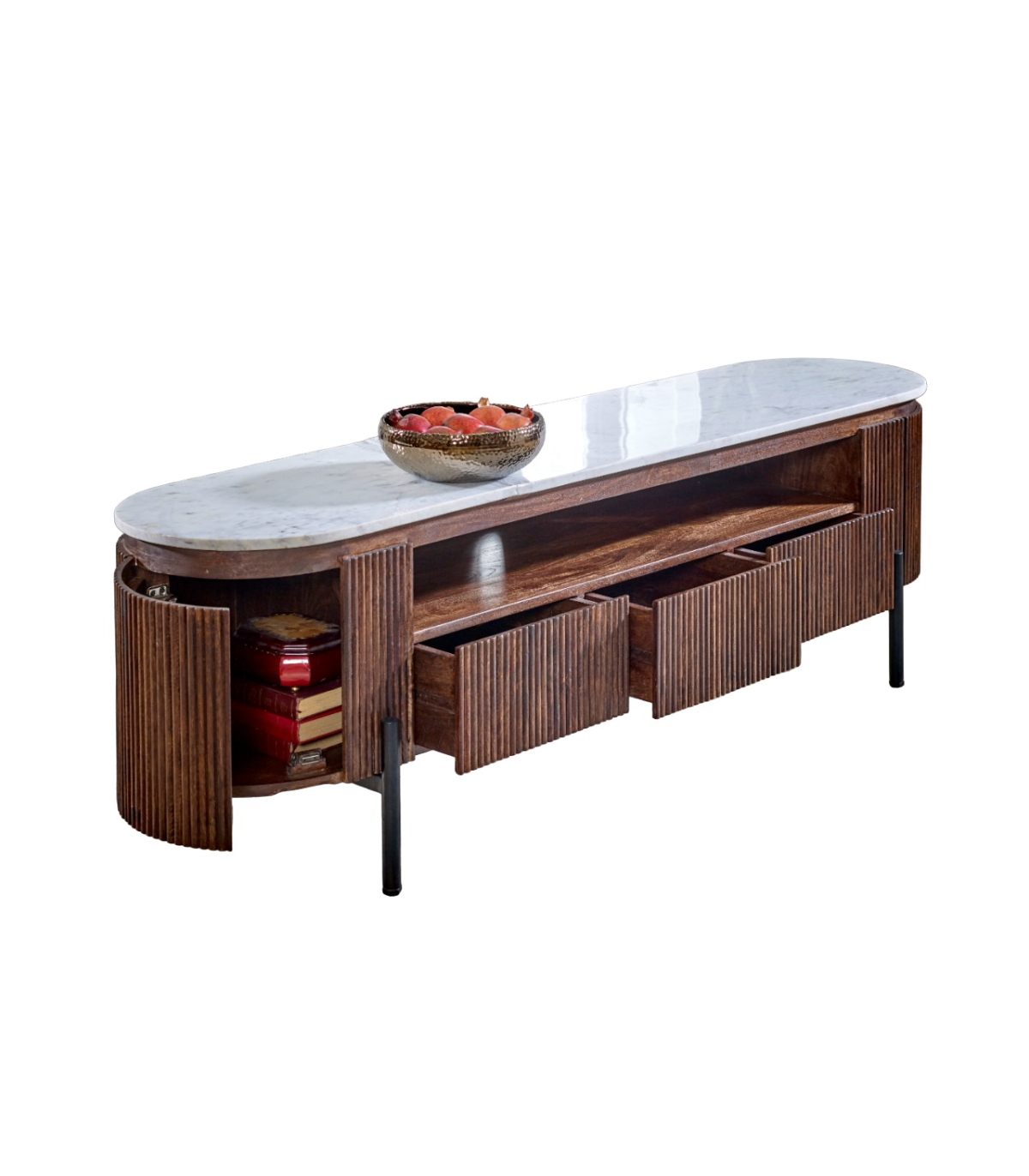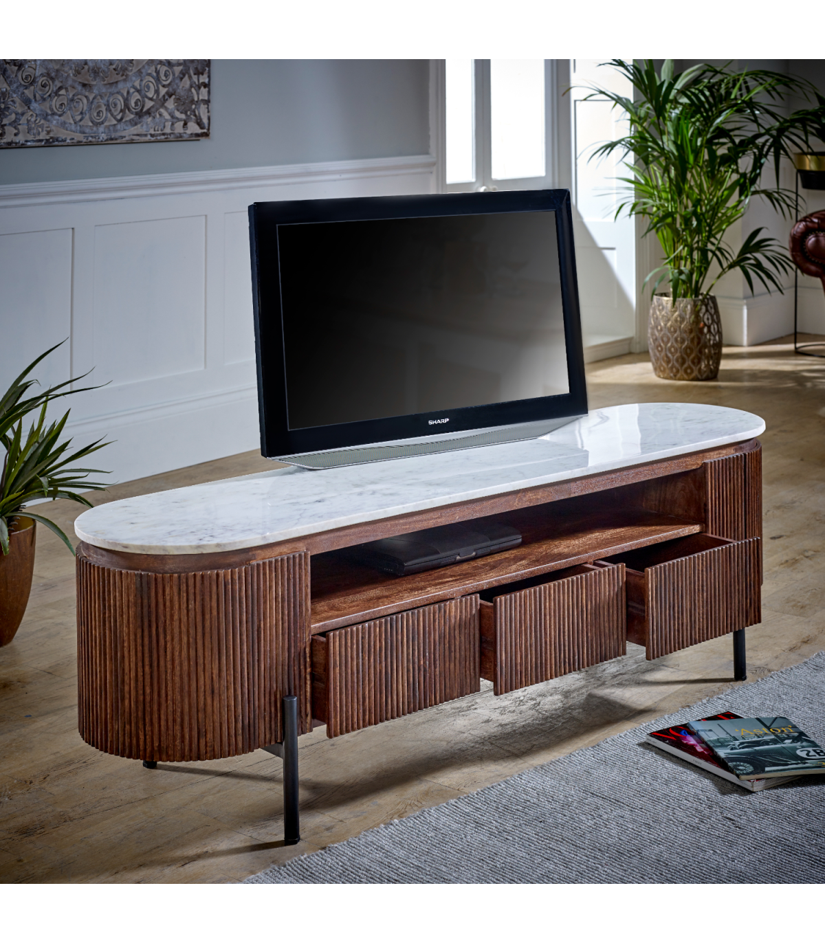 This dark mango tv stand is designed to hold a larger tv and is wider than the alternative smaller version in this range. The beautifully crafted rounded edges and the elegant marble top will stand the test of time whilst the artwork fluted mango wood surround compliments it perfectly. Features include 2 cupboards, 3 good sized drawers to store all your remotes, game controllers whilst not in use, and an open shelf. The open shelf is ideal for any gaming / media equipment you may have. Sturdy metal legs complete the look of this item which is completely handmade by our skilled craftsmen in India using eco friendly materials. Made from 100% mango wood and natural marble each piece is individual and unique.