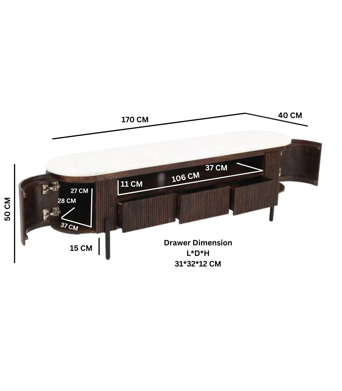 Mango wood large TV stand with real white marble top & metal legs. Made from 100% mango wood and natural marble each piece is individual and unique. , Material - Marble, Asshmebly - Partial, Drawer/Cupboard dimensions (cm)31 X 32 X 12 - 31 X 32 X 12, Collection Name - Opal