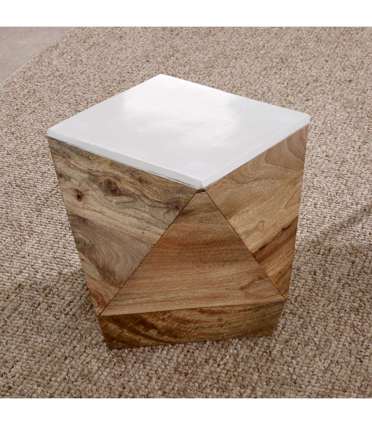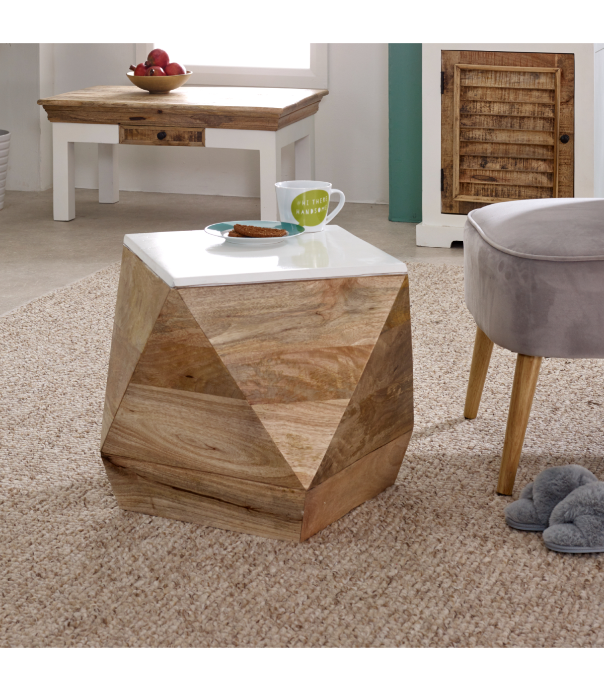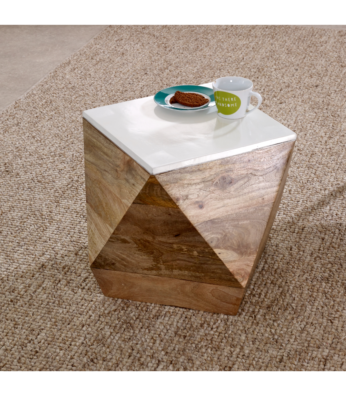 Mango side table with contrasting white top and natural colour finish. Handmade by skilled craftsmen in India using 100% eco sourced wood, making each piece individual and unique. Material - Mango Wood, Asshmebly - Fully Assembled, Collection Name - Alfie