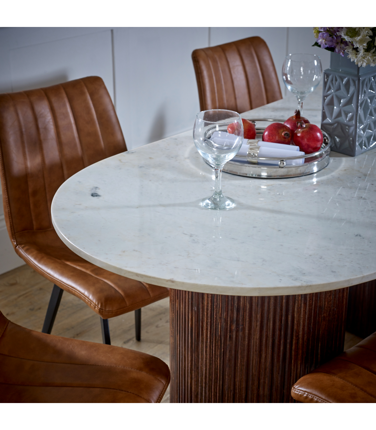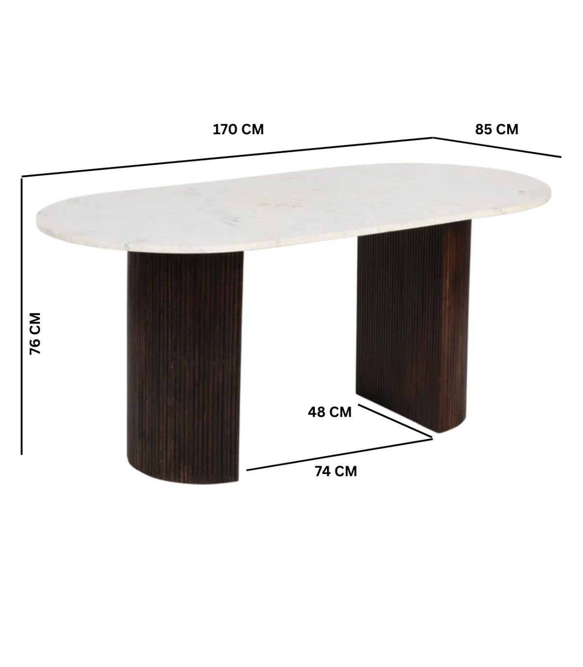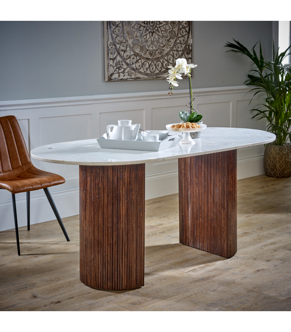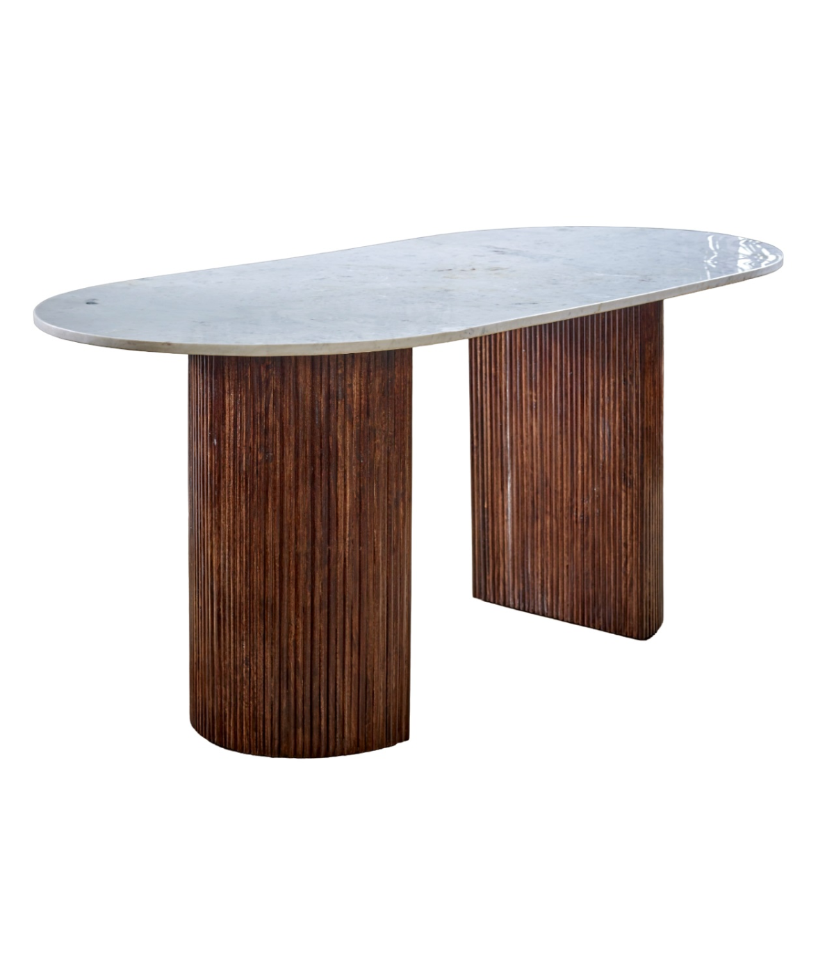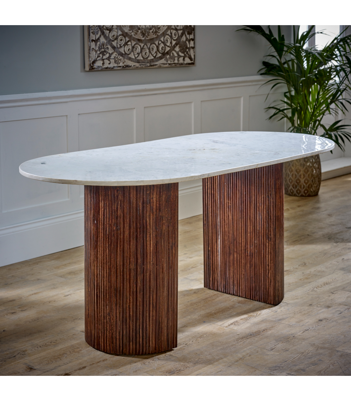 This is the larger dining table in our Opal range and will look stunning when holding any dinner parties / special events. The beautiful simplicity of the natural marble with the fluted wooden supports are exquisite and will certainly be a statement piece in your home. Completely handmade by our skilled craftsmen in India using eco friendly materials. Made from 100% mango wood and natural marble.