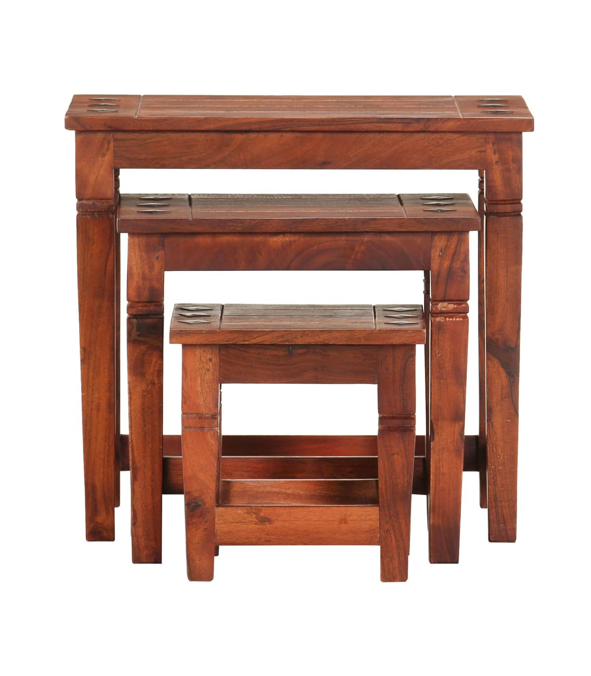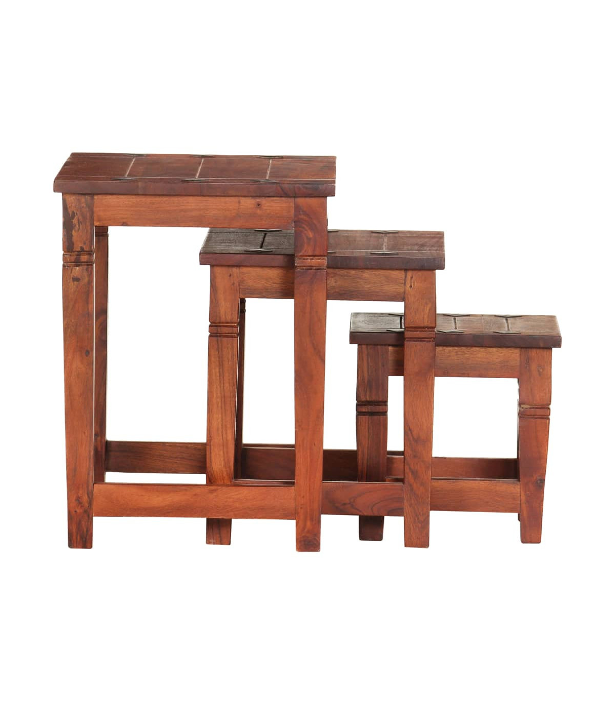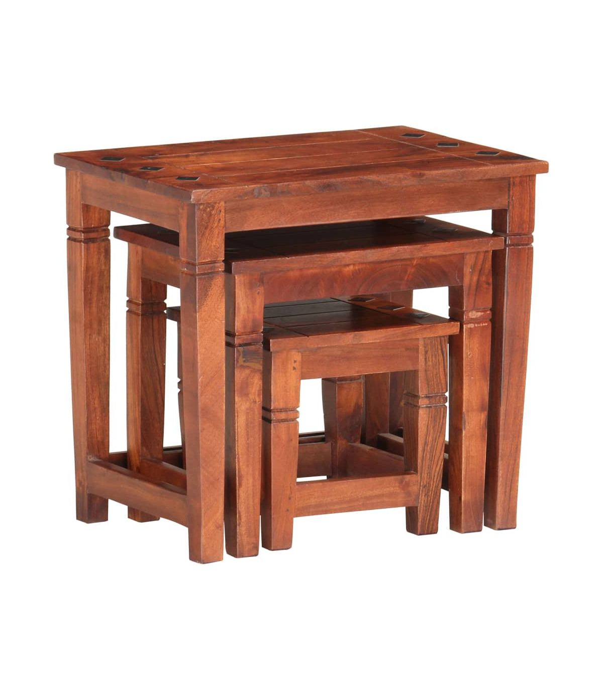 This antique-style wooden nest of tables is a timeless accessory for your home. They can be used as side tables, coffee tables, nightstands, etc. Being stackable, these tables save a lot of space when not in use. This set of tables is made of solid acacia wood that has been given a walnut finish by polishing, painting and lacquering to provide a refined look. The beautiful wood grains make them unique and slightly different from each other. Delivery includes 3 tables in different sizes. Important note: Colours vary from piece to piece, making each of our tables unique; the delivery is random.