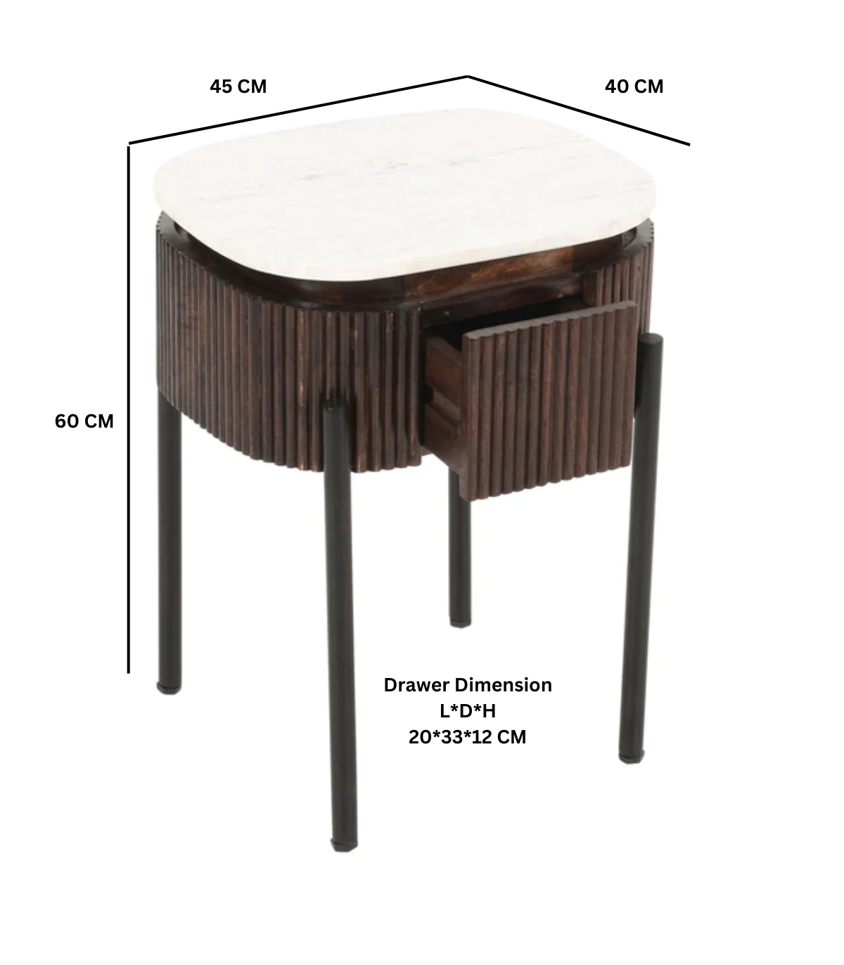 Mango wood bedside table with marble top & metal legs. Completely handmade by our skilled craftsmen in India using eco friendly materials. , Material - Marble, Asshmebly - Partial, Drawer/Cupboard dimensions (cm)14 X 30 X 9 - 14 X 30 X 9, Collection Name - Opal