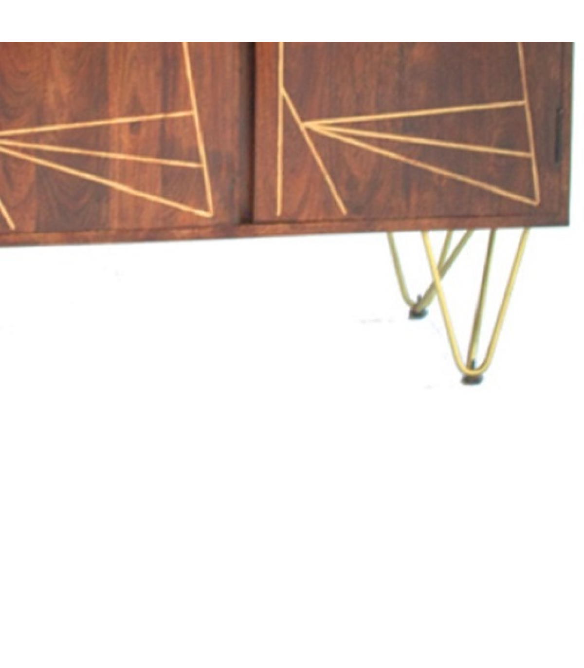 This modern contemporary style furniture combining metal inlay on solid wood creating an abstract style, is taking the furniture making to a whole new level. The angled legs made of metal adds to the retro vintage look. Material - Solid Wood, Asshmebly - Fully Assembled, Drawer/Cupboard dimensions (cm)removable shelves - removable shelves, Shelves dimensions (cm) - 30x42x31.5 upper shelf 30x42x34 lower shelf, Collection Name - Dark Gold