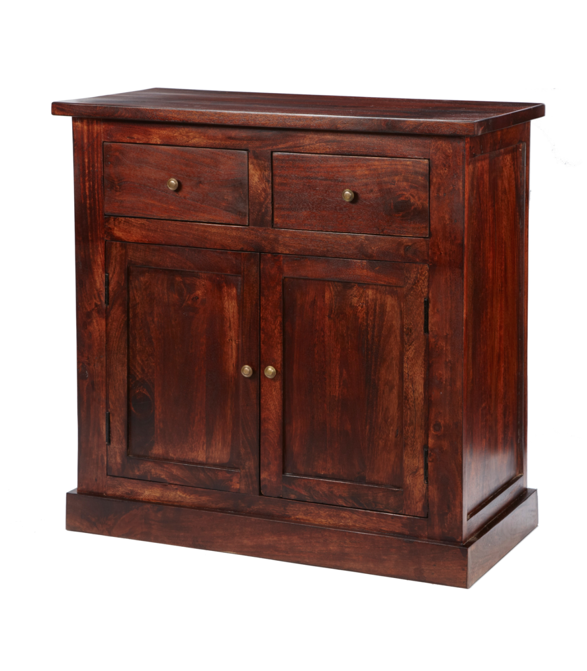 Handmade from Solid Mango Wood featuring brass handles and 2 shelf and 2 drawers in dark Mahogany hue.
