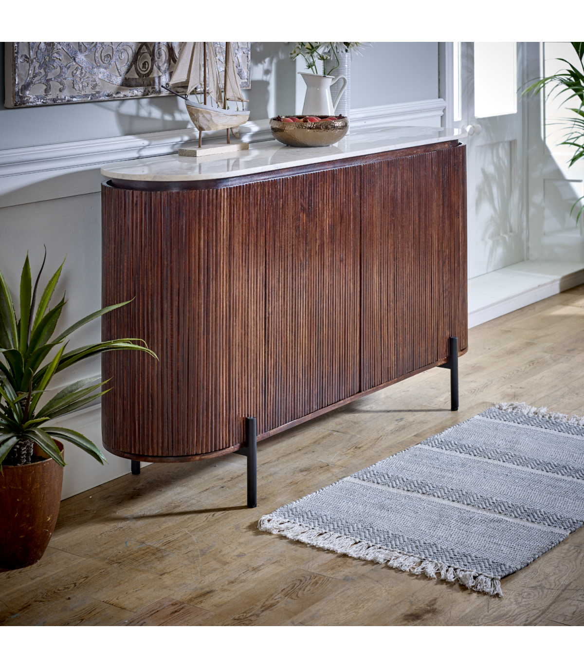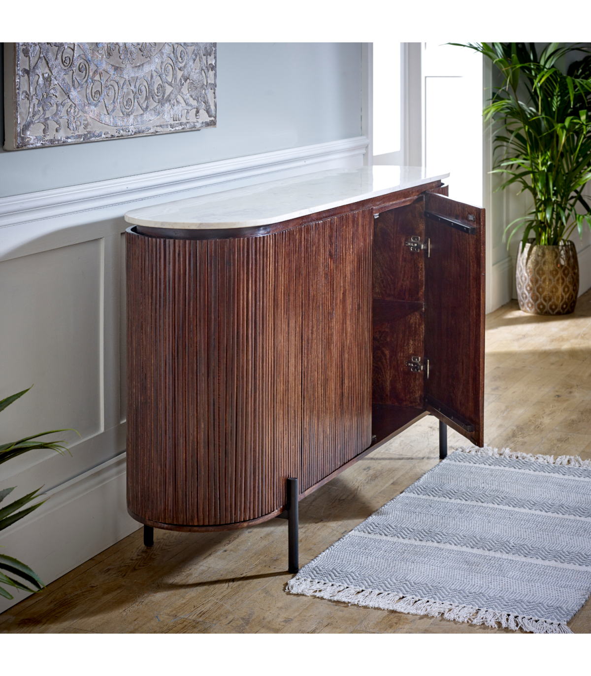 This exquisite sideboard is the larger one in our Opal range and is a statement piece for any room in your house. Featuring 3 separate storage areas with shelves concealed by 4 doors you can hide any items needed to hand but not in view, alongside books / media devices / games etc. The elegant marble top will stand the test of time and showcase any photos or plants for display, whilst the Artwork fluted mango wood surround compliments it perfectly. Sturdy metal legs complete the look of this item which is completely handmade by our skilled craftsmen in India using eco friendly materials.