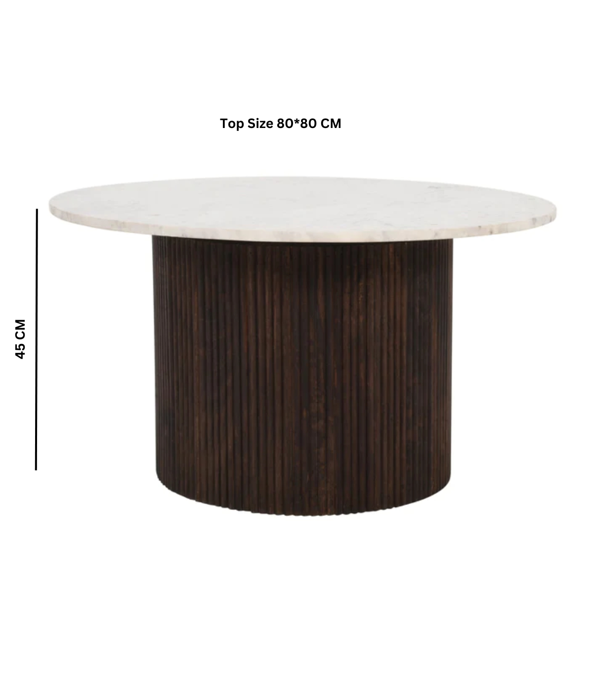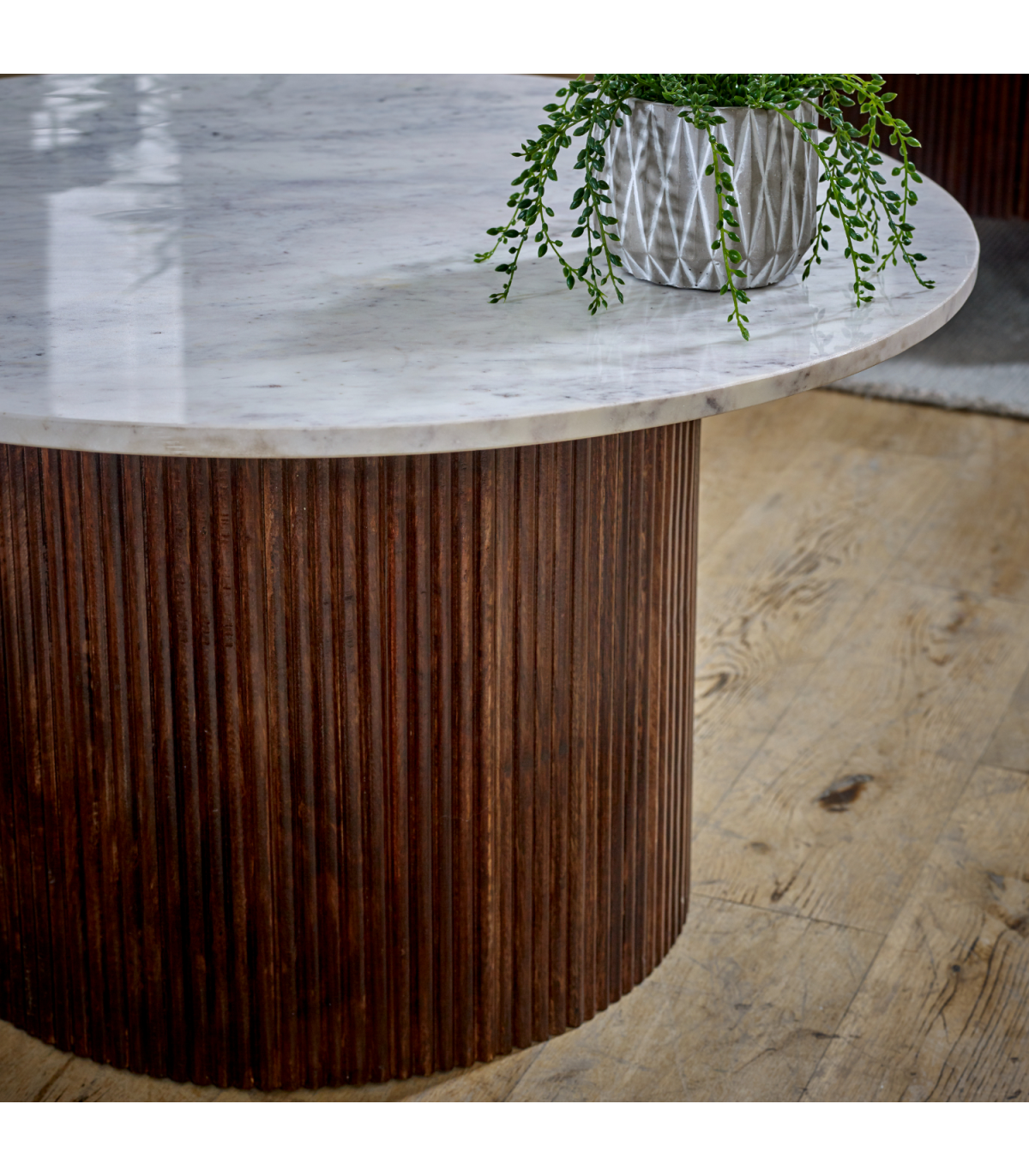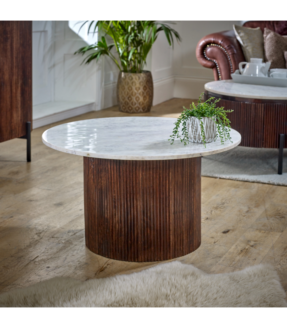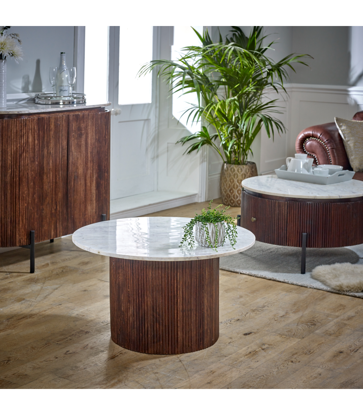 This is the more chunky design coffee table in this range and does not have any drawers. The stunning simplicity of the natural marble with the fluted wooden surround are exquisite and will certainly be a statement piece in your home. Completely handmade by our skilled craftsmen in India using eco friendly materials. Made from 100% mango wood and natural marble.