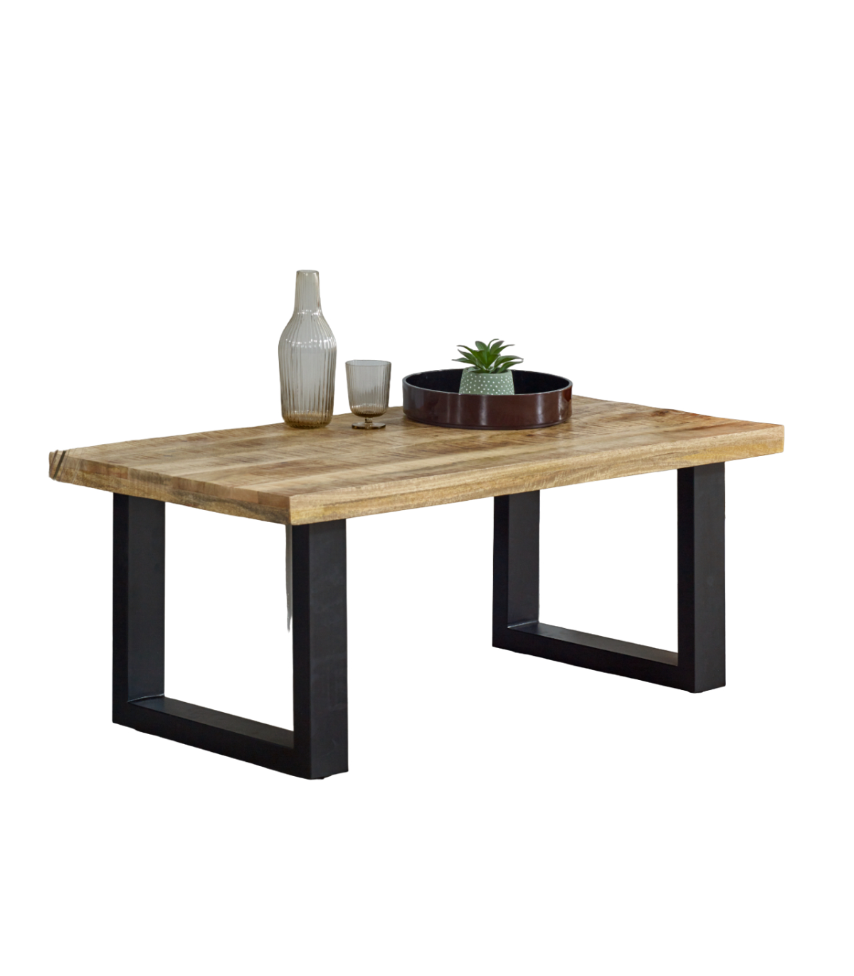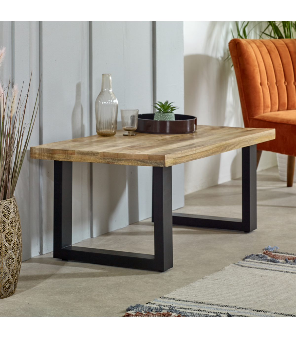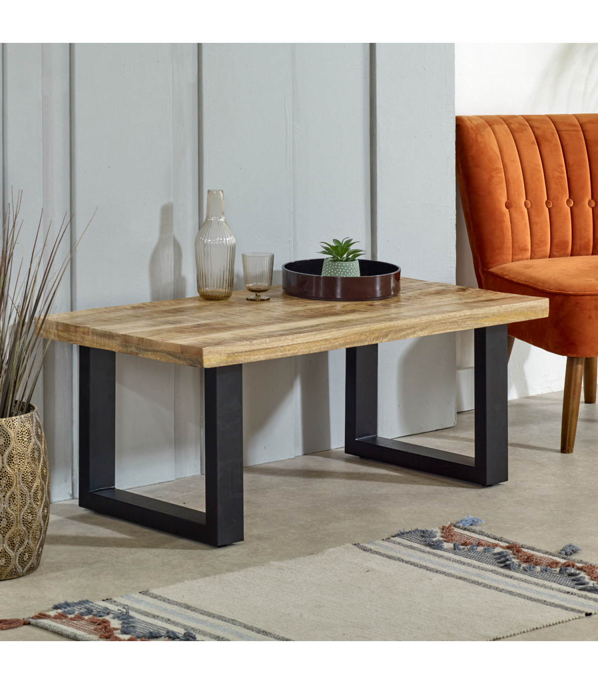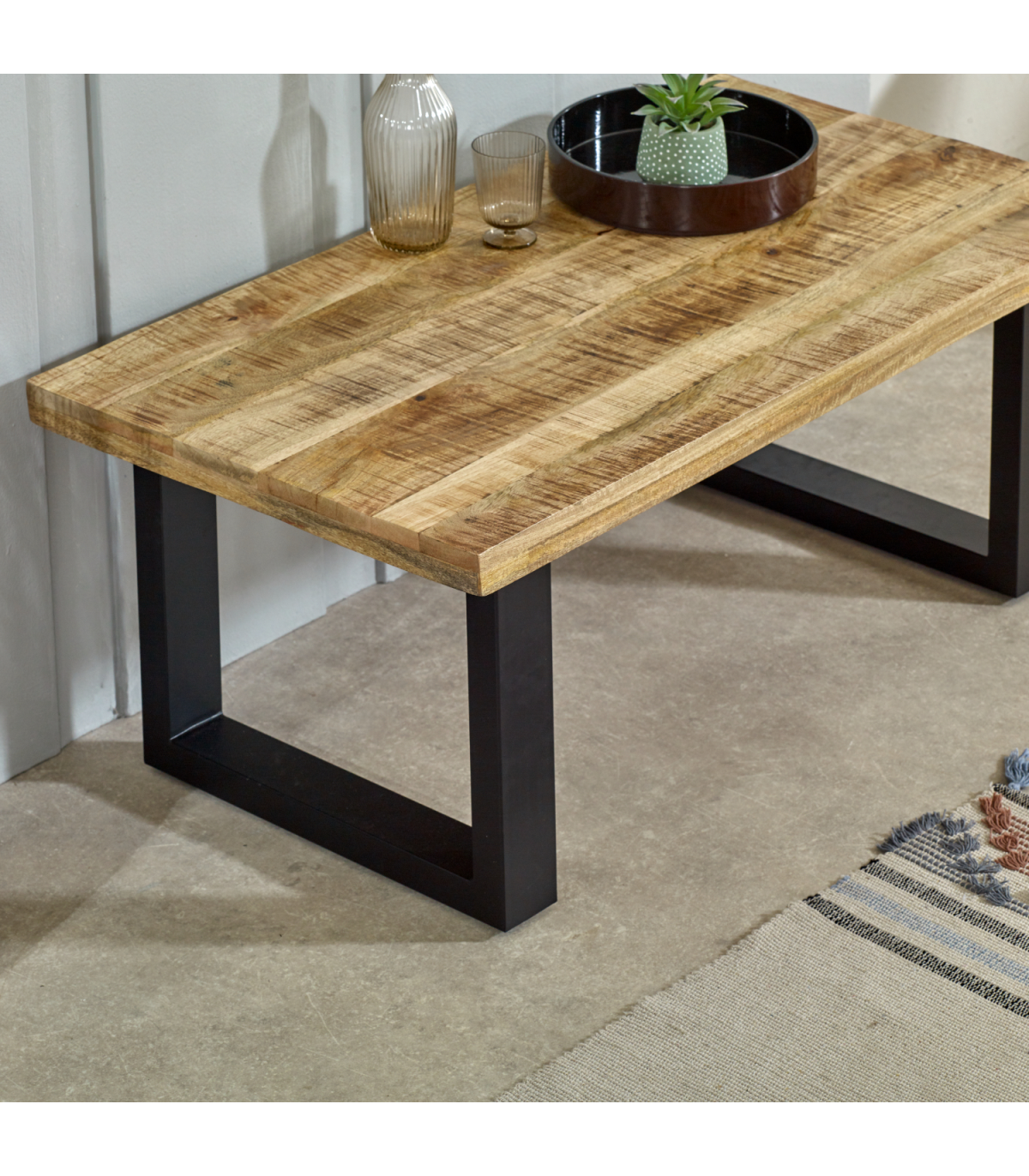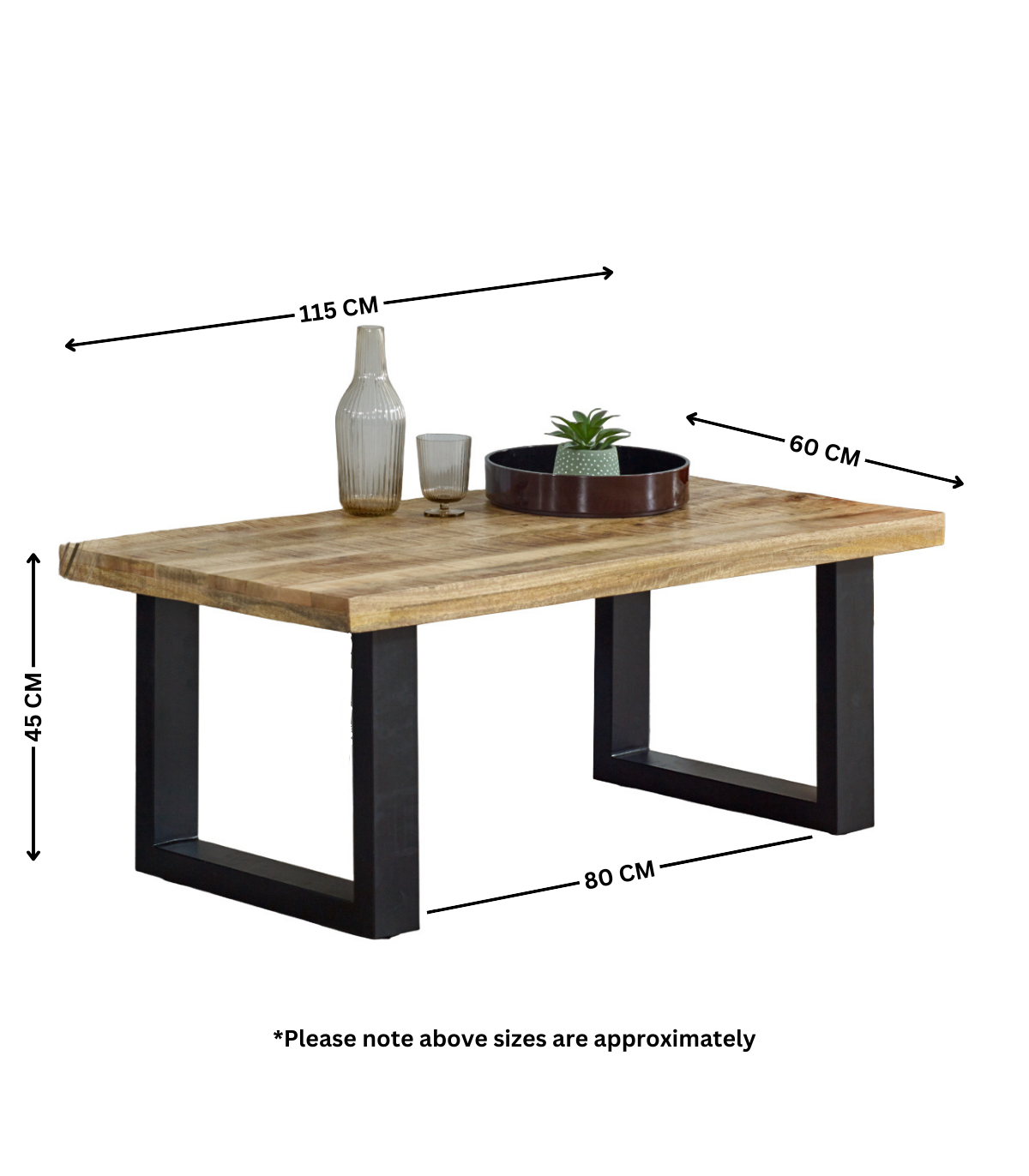 This modern design coffee table in our Surrey Range offers an alternative look and will look outstanding in any room of your choosing. Perfect for afternoon coffee or cosy evenings in front of the tv. The rough sawn laquered finish top and the straight rectangular metal legs are both rustic and modern, highlighting the natural beauty of the wood with a handmade unique look and feel. Made entirely using 100% Eco sourced solid natural wood by skilled craftsmen in India.