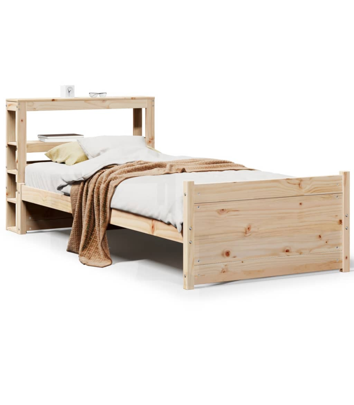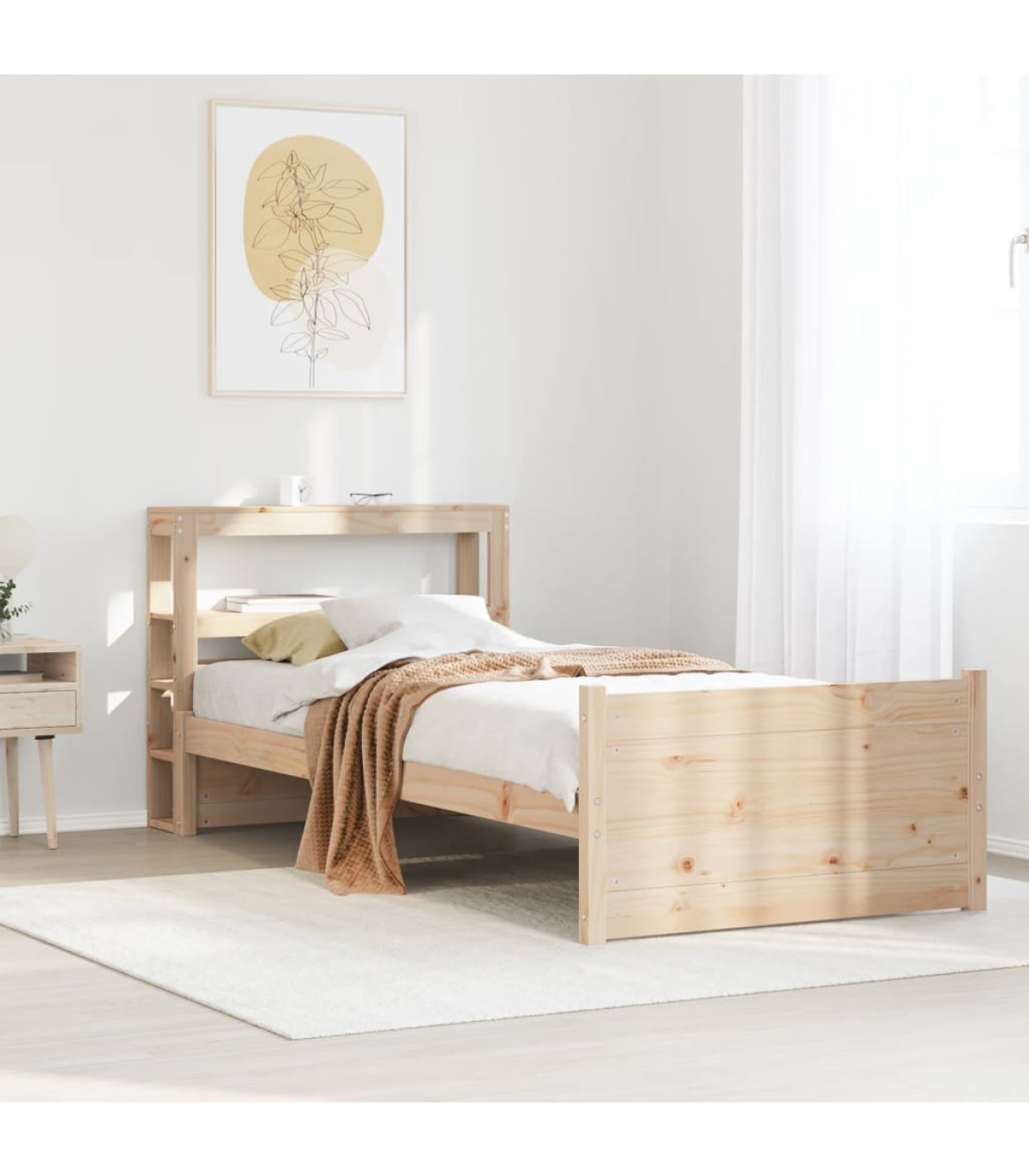 Enjoy a good night's sleep in this wooden bed frame! It makes a practical and decorative addition to your interior. Solid pine wood: Solid pine wood is a beautiful natural material. Pine wood has a straight grain, and the knots give the material its signature, rustic look.Sturdy bed frame: The wooden frame ensures sturdiness and stability. The plywood slats provide good weight distribution, ensuring that the mattress stays in place with every twist and turn of your body during sleep.Functional headboard and footboard: The headboard and footboard of the wooden bed can keep your mattress in place. Also, the headboard provides you with excellent back support when you sit up in bed to read or watch TV.Ample storage space: This sleek headboard features two convenient shelves, offering ample storage space to keep all your nighttime essentials within easy reach. Good to know:A mattress is not included with this bed. We do offer a various selection of mattresses. You can check our shop for a matching mattress.