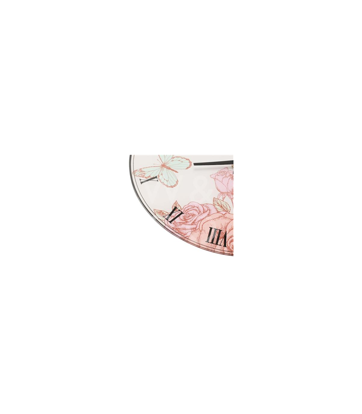 A floral butterfly glass wall clock by HOMETIME®. This round wall clock adds instant character to any living space. The round, glass wall clock showcases a white clock face, complete with gorgeous, printed butterfly images. It is finished by a black Roman dial and matching straight clock hands, bringing the whole clock to life as a true statement piece for the wall. The clock is packaged in a brown box.