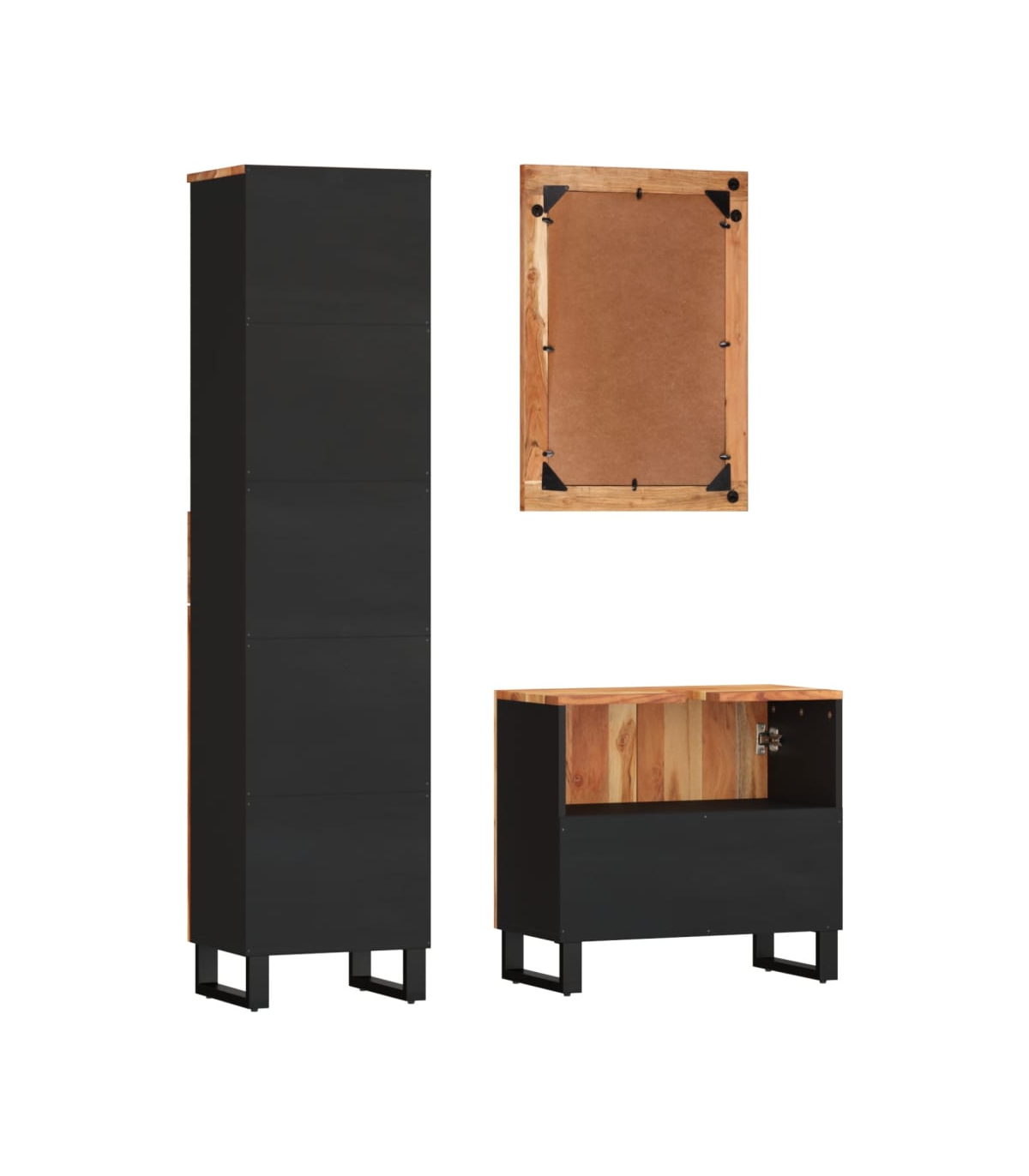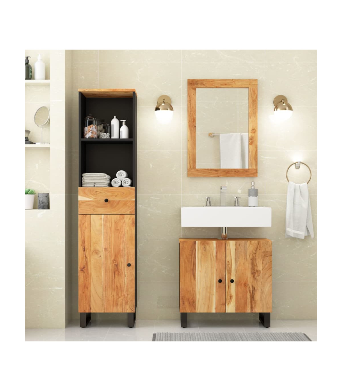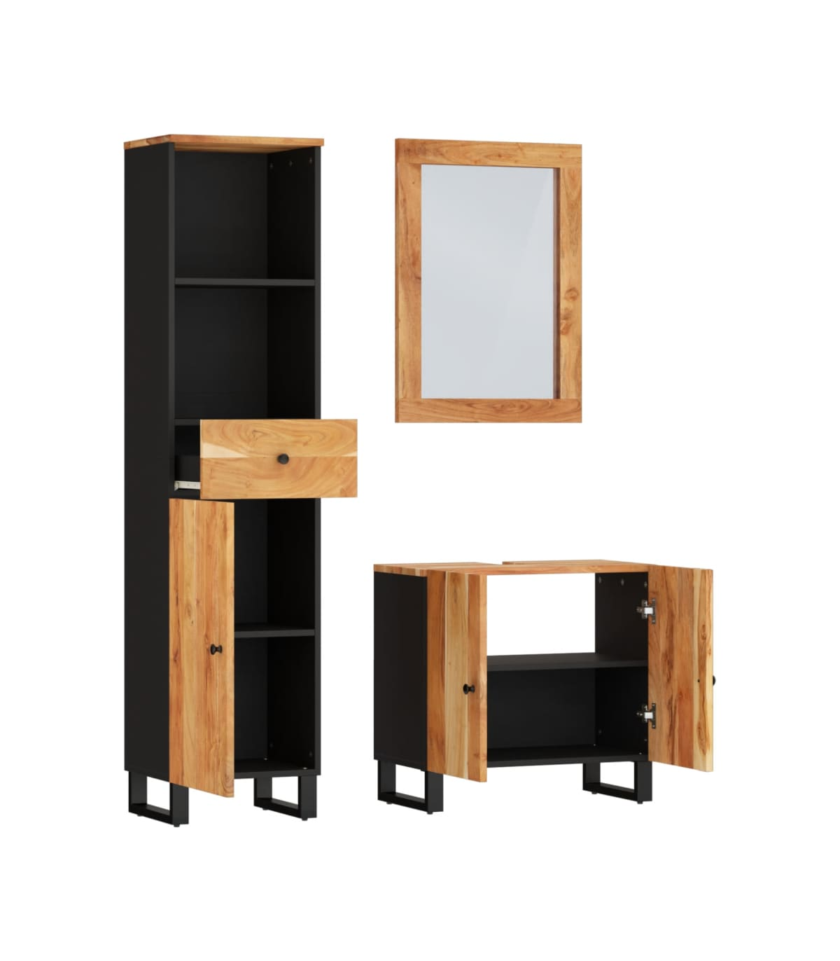 This handy bathroom furniture set, featuring spacious storage space, is an excellent addition to your bathroom, giving it a tidy and striking appearance! Solid acacia wood: The cabinet is made of solid acacia wood combined with engineered wood. Solid acacia wood is a beautiful natural material. Acacia wood is a tropical hardwood, which is dense, sturdy, and durable.Ample storage space: The bathroom storage cabinet provides various storage options and spacious space for you to store items in your bathroom.Stable feet: The iron feet of the bathroom cabinet ensure sturdiness and stability.Practical design: The top of the bathroom sink cabinet is ideal for placing the sink.Clear image: The glass mirror face provides a clear image. So, you can enjoy a beautiful and natural reflection when standing in front of it. Warning:To prevent it being overturned, this product must be used with the provided wall attachment device.Good to know:The sink is not included in the delivery.Screws and plugs for inside the wall are not included. We advise to find and use screws and plugs suitable specifically for your walls. If you're not sure, you can consult with a professional. Please read and follow each step of the instructions.Each item is unique with variations in colours and grains. The delivery is random, ensuring the exclusivity and individuality of your product.