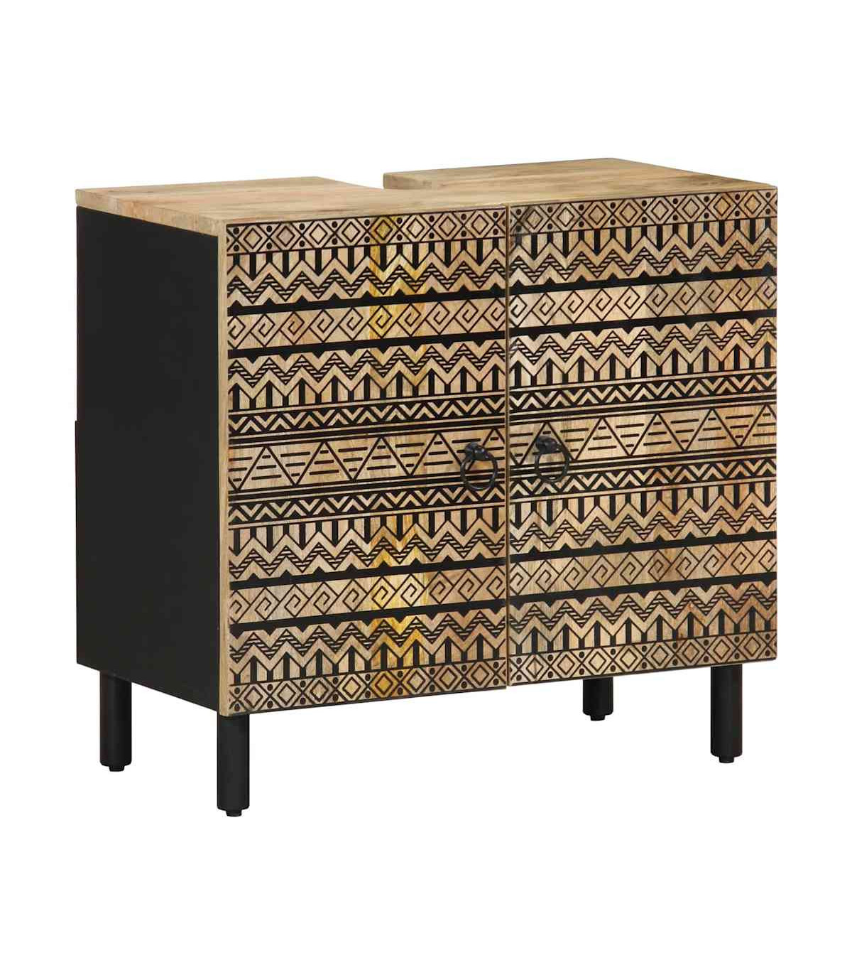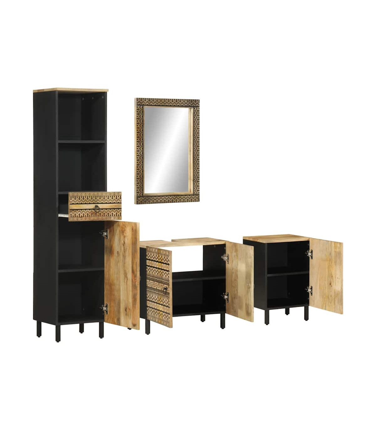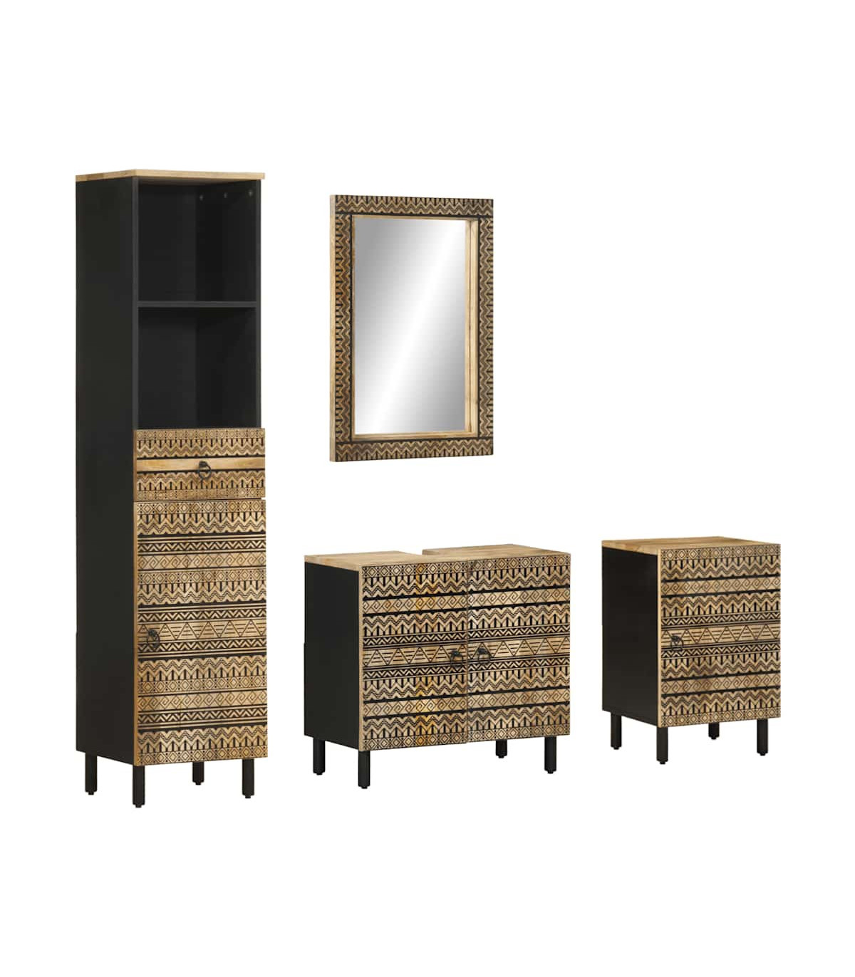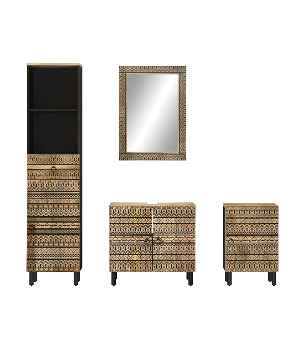This wooden bathroom furniture set is an excellent addition to your bathroom, giving it a tidy and striking appearance! Robust and stable material: Solid mango wood, a robust tropical hardwood, is highly favoured for furniture making for its exceptional durability and strength. Its beautiful wood grains make every piece of furniture slightly different from the next.Ample storage space: This bathroom furniture offers ample storage space to keep your essentials well organised and within reach.Clear image: The vanity mirror face provides a clear image. So, you can enjoy a beautiful and natural reflection when standing in front of it.Wall-mounted design: The cosmetic mirror can be wall-mounted, which makes it especially suitable for rooms with limited space.Sturdy legs: The iron legs add the bathroom cabinet's sturdiness and stability. Warning:To prevent it from tipping over, this product must be used with the provided wall attachment device. Good to know:Screws and plugs for inside the wall are not included. We advise to find and use screws and plugs suitable specifically for your walls. If you're not sure, you can consult with a professional. Please read and follow each step of the instructions.Each item is unique with variations in colours and grains. The delivery is random, ensuring the exclusivity and individuality of your product.