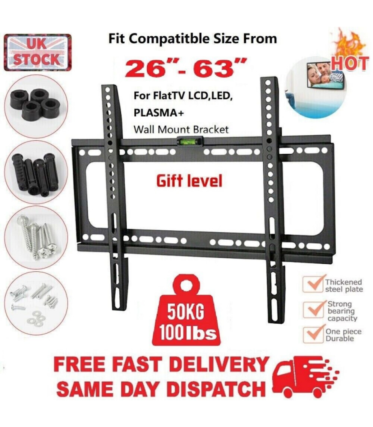 TV Wall Bracket Mount Slim LCD LED Plasma For 26 30 32 40 42 50 55 Upto 63 Inch