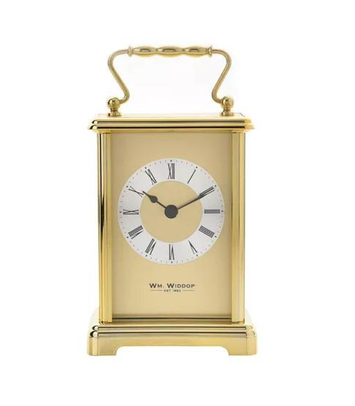 A contemporary carriage clock from Wm.Widdop, with more than a nod to nostalgia this style of carriage clock, never goes out of fashion. The elegant gold-coloured case sets off the two-tone gilt dial beautifully. A lovely addition to your home, or why not gift for a lovely present.