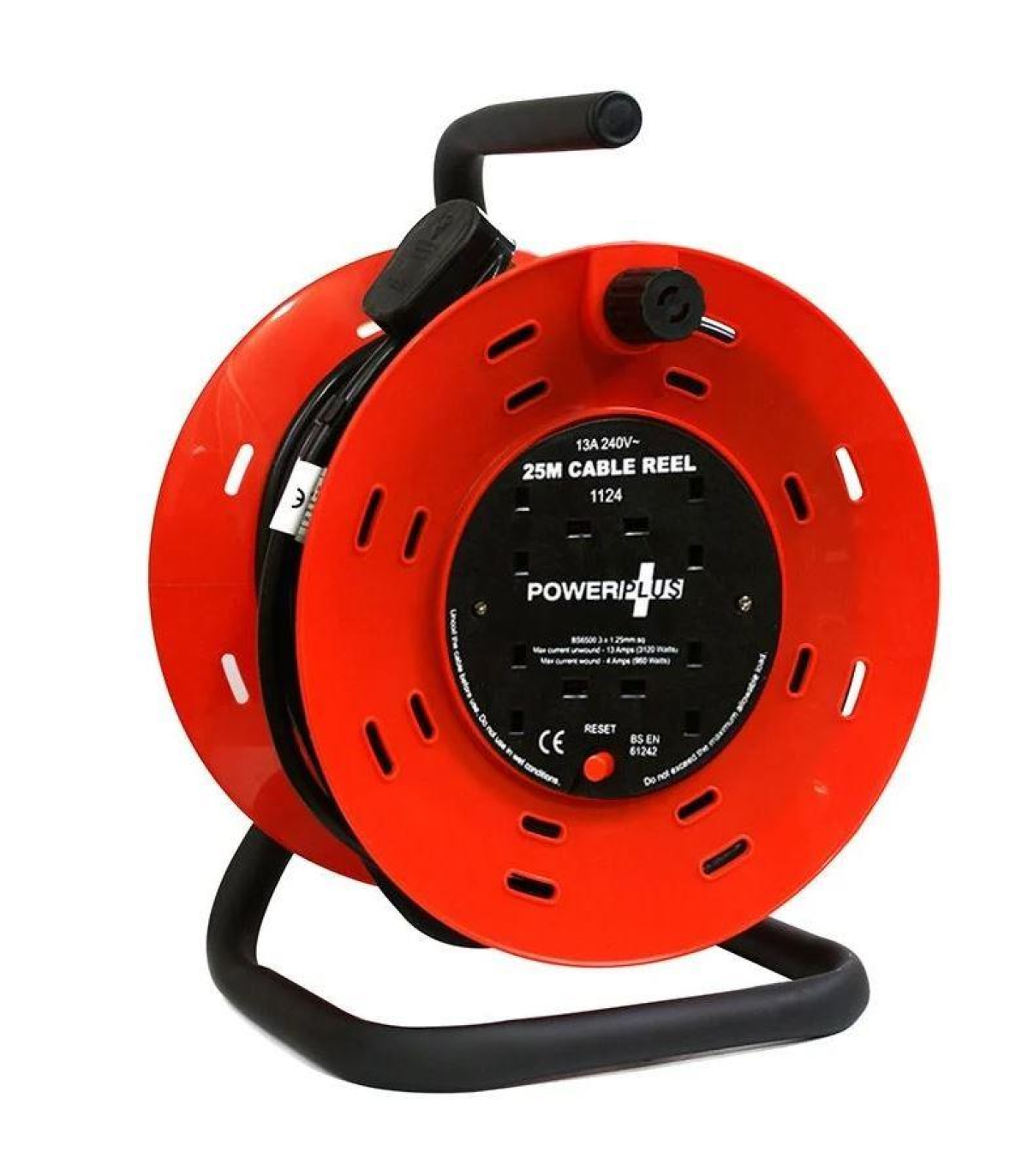 Power Plus - 4 Way Extension Reel - 25 Metre - 240 Voltage - 13 Amp - [PU-1124] Innovative reel system Thermal cut-out switch Robust steel construction 25 Metre length 13Amp - 240V Max current unwound - 13 Amps (3120 Watts) Max current wound - 4 Amps (960 Watts)