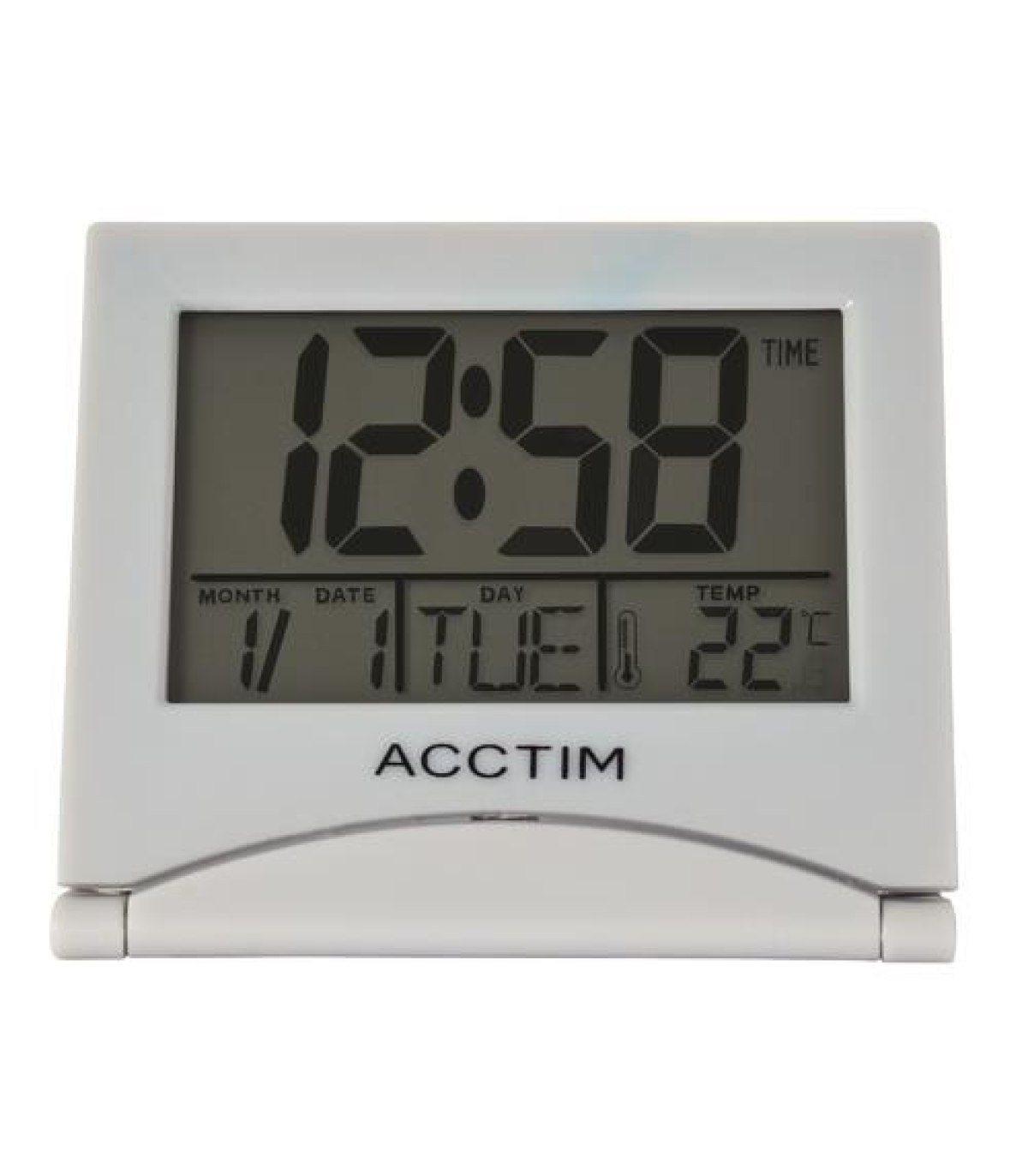 The Acctim Mini Flip alarm clock in silver is compact in size, making it ideal for taking on your travels. The LCD display shows time, calendar and indoor temperature clearly and the alarm with snooze function will make sure you wake up in time. The convenient folding travel case and included batteries make this clock ready to use straight out of the box.