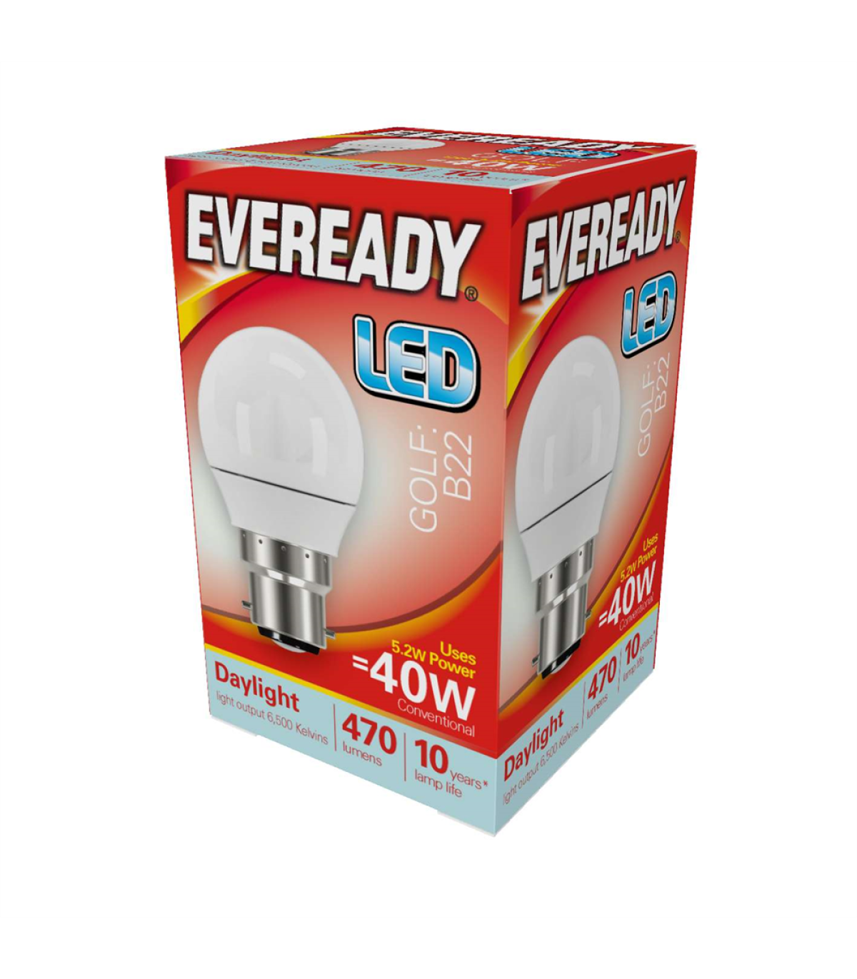 Eveready S13603 LED Golf Bulb 40w B22 (BC) 470lm 4.9W Daylight (Pack of 5) 4.9W / 40W Replacement 470 Lumen 6,500K (Daylight) Non-Dimmable 220-240V Energy Rating F