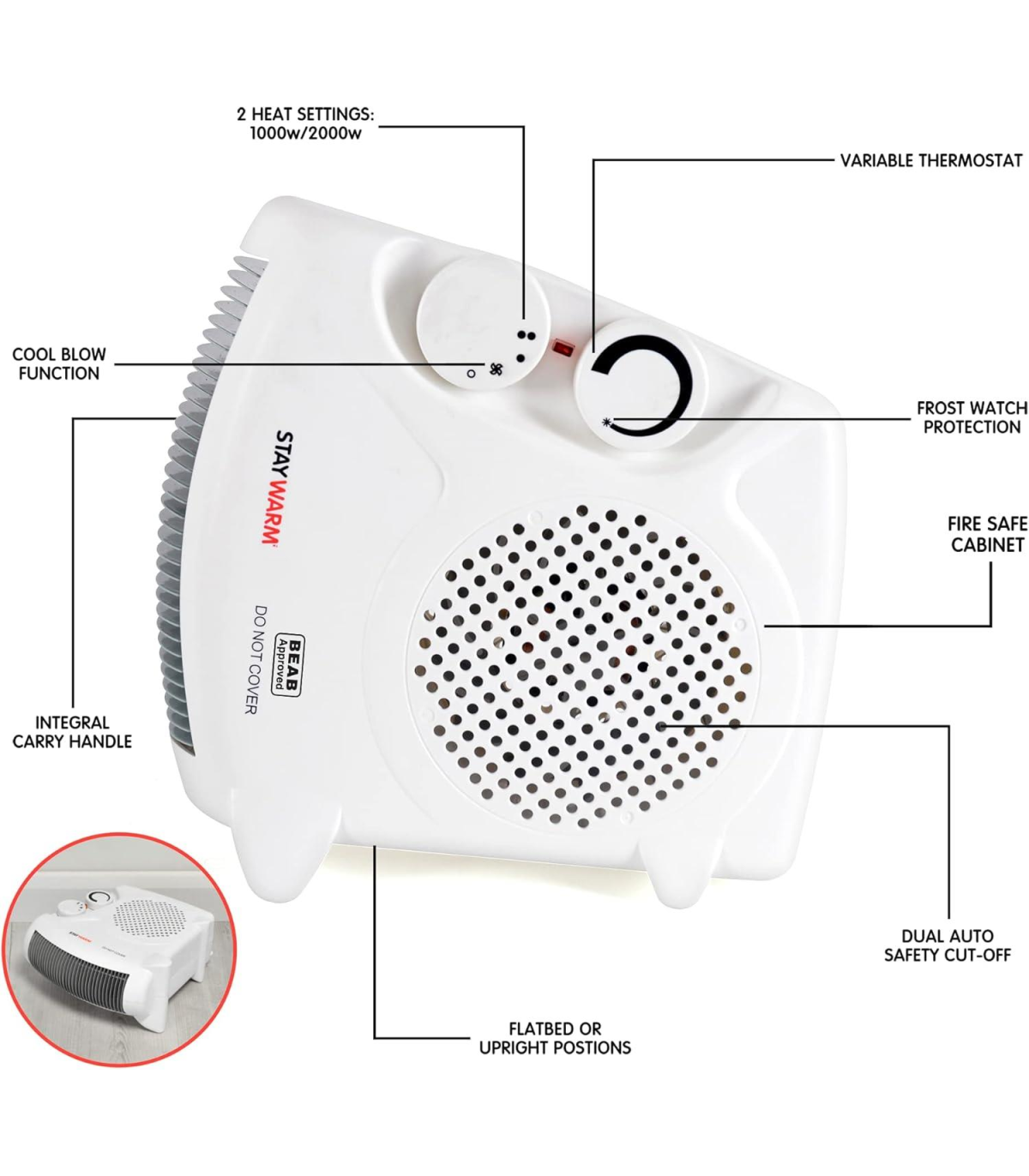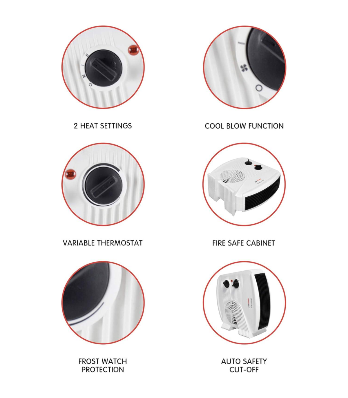 - TWO HEAT SETTINGS AND COOL BLOW FAN: Switch between the two heat settings (1000w/2000w) to set the power of the fan or use the cool blow function to operate as a cooling fan. Save money and space in your home with this multi-use hot and cool fan