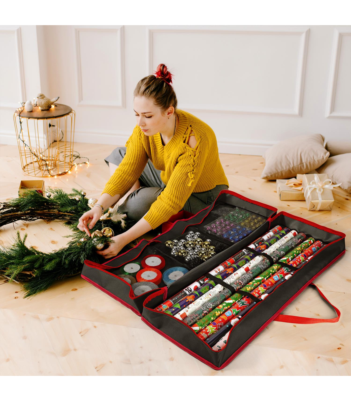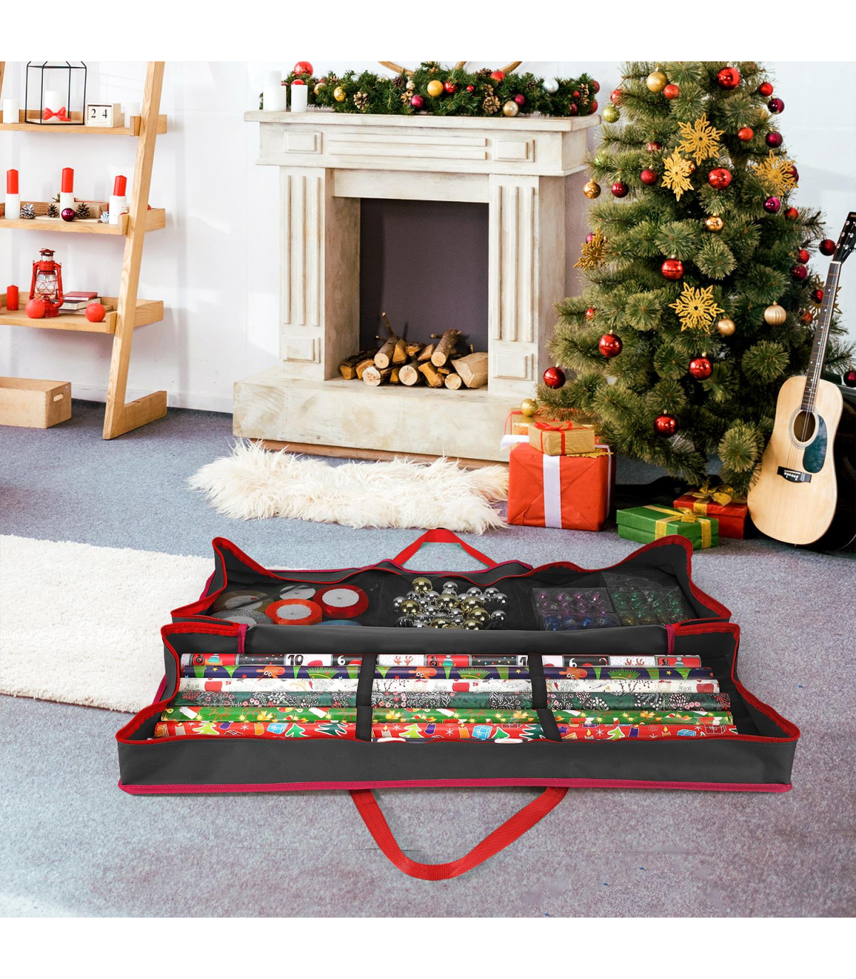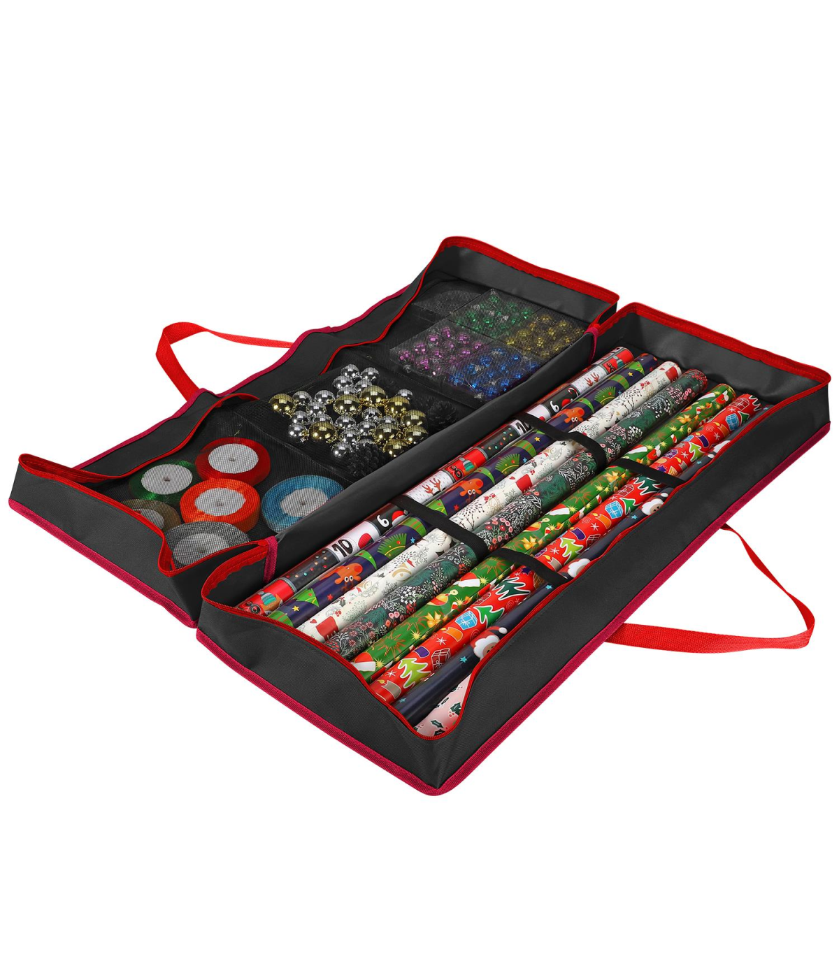 EASY TO STORE: Christmas storage bag features 2 large adjustable fastening straps suitable for placing the wrapping paper and mesh / net compartments for loose accessories. The ideal solution for storing all of your present wrapping goods clean, safe, cre
