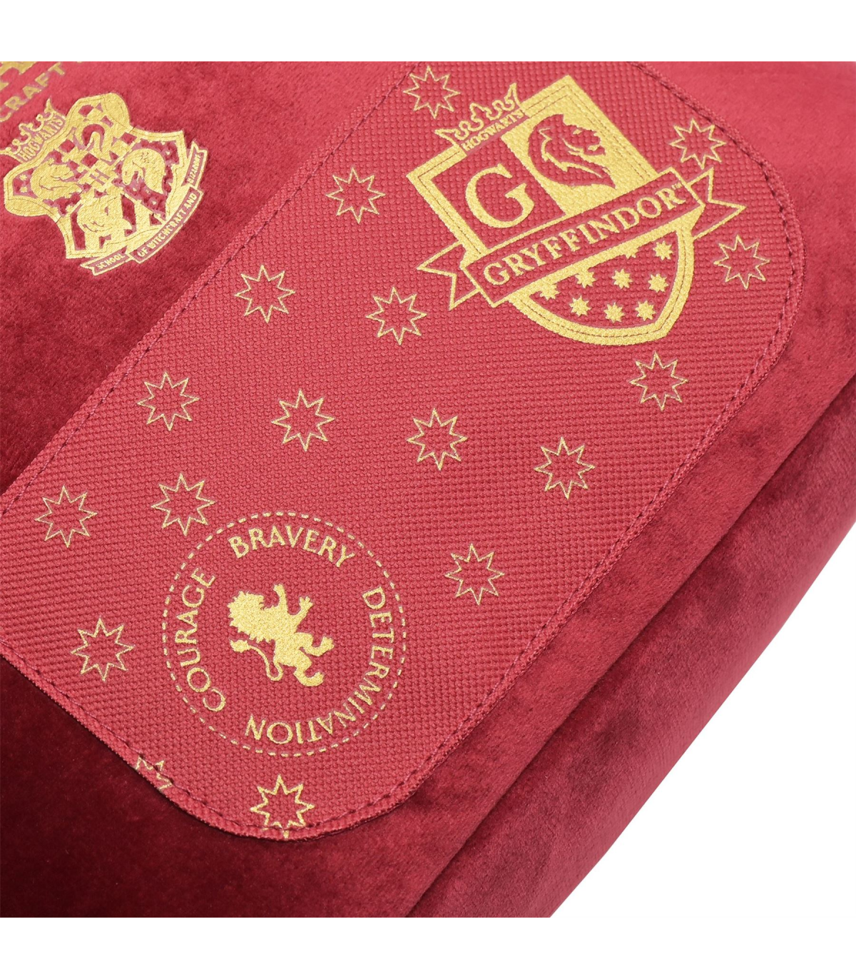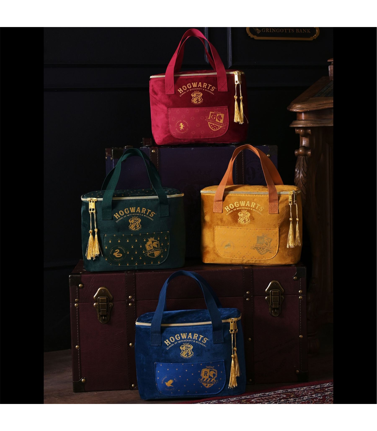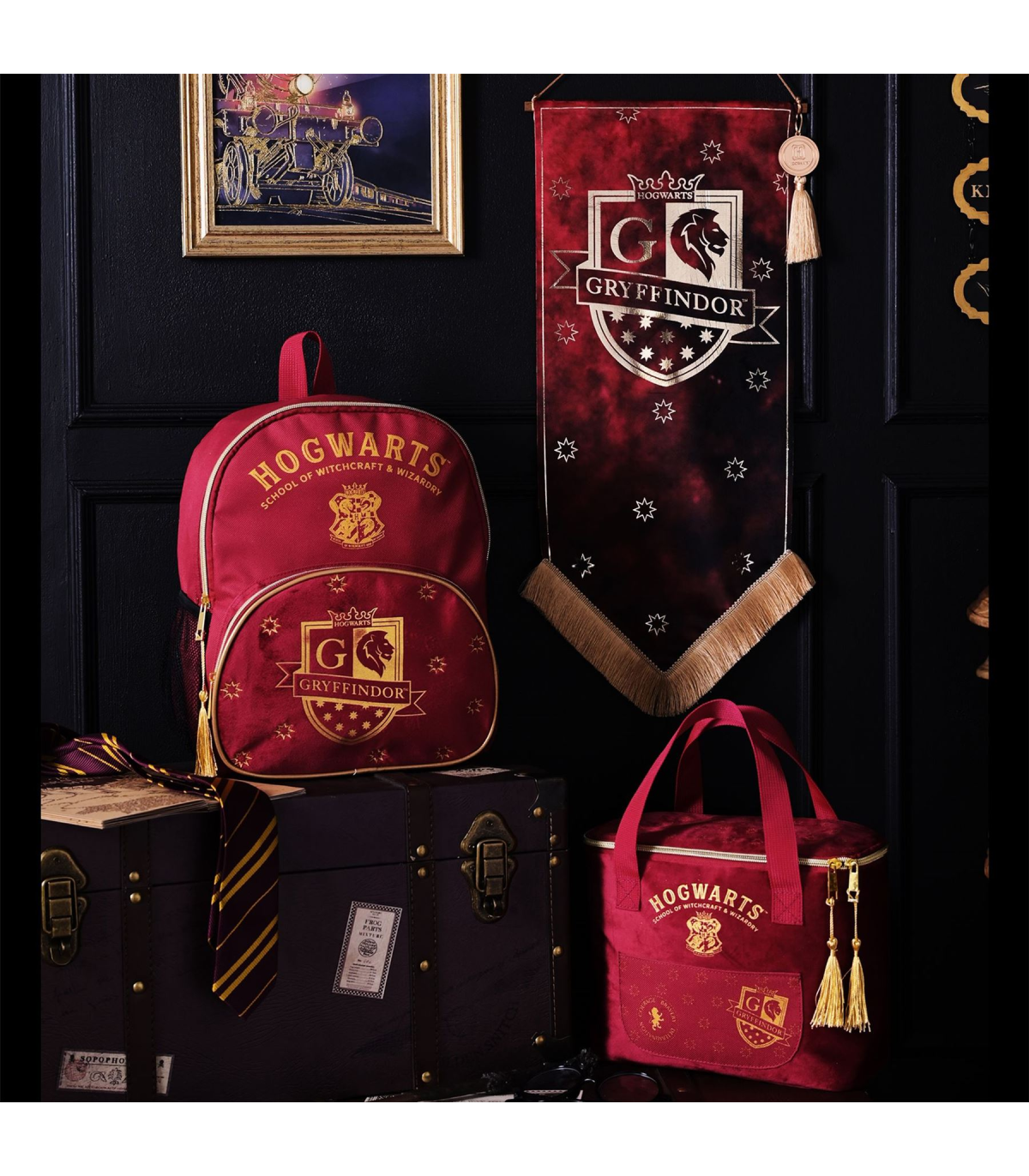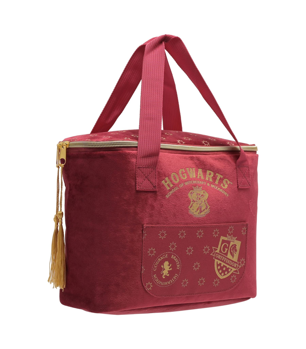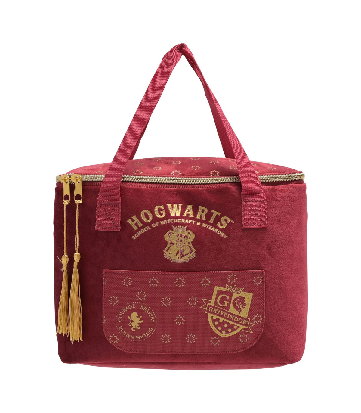 An Alumni Gryffindor lunch bag from Harry Potter by WARNER BROS�. This realistic lunch bag will transport Potterheads back to their magical days at Hogwarts. The durable bag showcases gorgeous red velvet, complete with textured (both embroidered and printed) �Hogwarts School of Witchcraft & Wizardry� title and Gryffindor house logo which is surrounded by stars. It offers spacious storage inside, furthered by matching handles and gold double zip with attached long tassels.