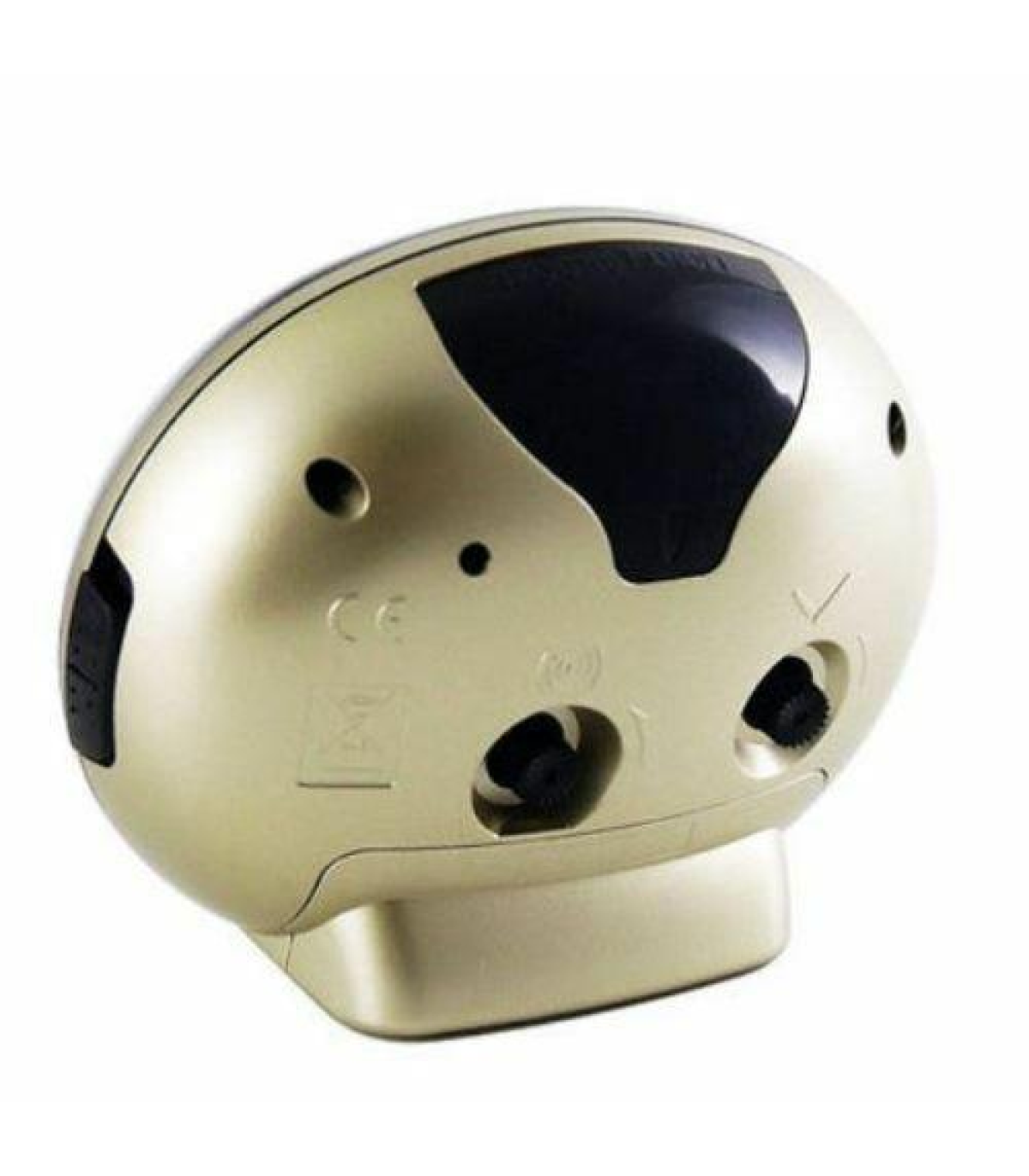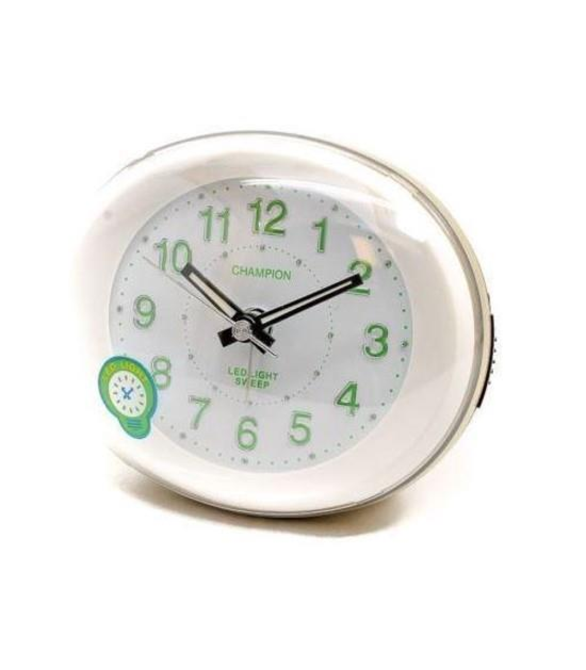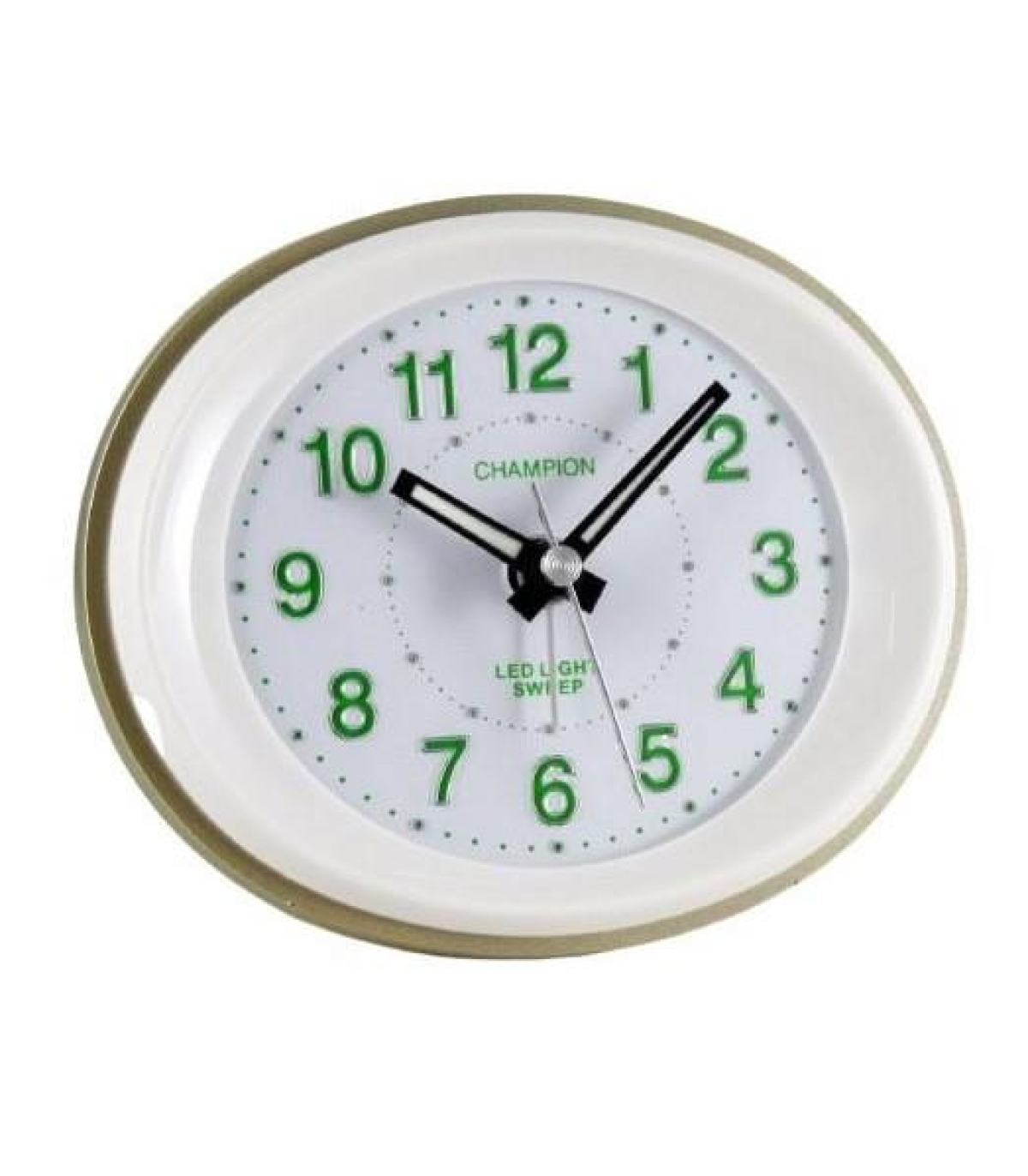 Champion Stylish Bold Traditional Oval Gold Quartz Sweeping Non Ticking Alarm Clock Oval sweep second alarm with green figure LED light dial. Large hands for easy viewing. Ascending alarm with snooze function. Side on -off switch Requires 1 x AA cell, Large snooze switch located on top of clock for ease of use. Dimensions 96 x 96 x 45mm
